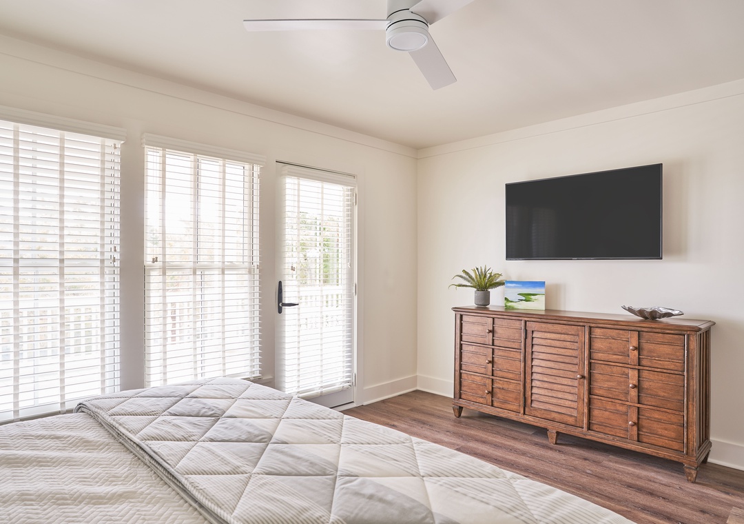 First Floor: Den with TV and front covered porch access. Primary Bedroom with King Bed, Flat Screen TV, and canal-side covered porch access and water view. The Primary Bathroom with zero entry shower can be accessed via the Primary Bedroom or hallway. The second bedroom with king bed shares a Jack/Jill bathroom adjacent to another guest bedroom with two twin beds. Each King Bedroom has access to a covered porch spanning the canal side with water views. The lower front porch gives additional views.
