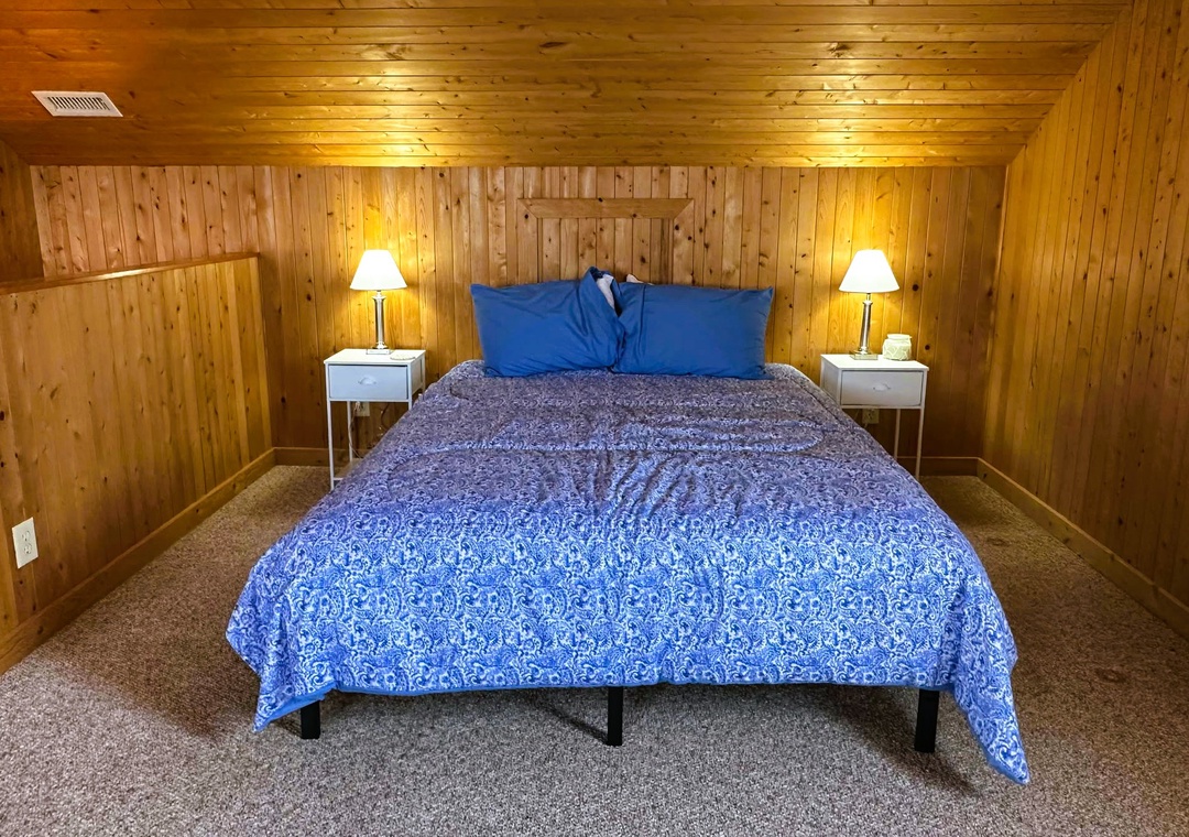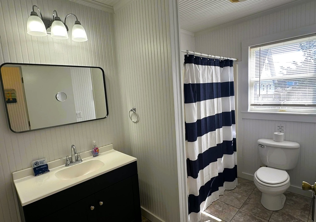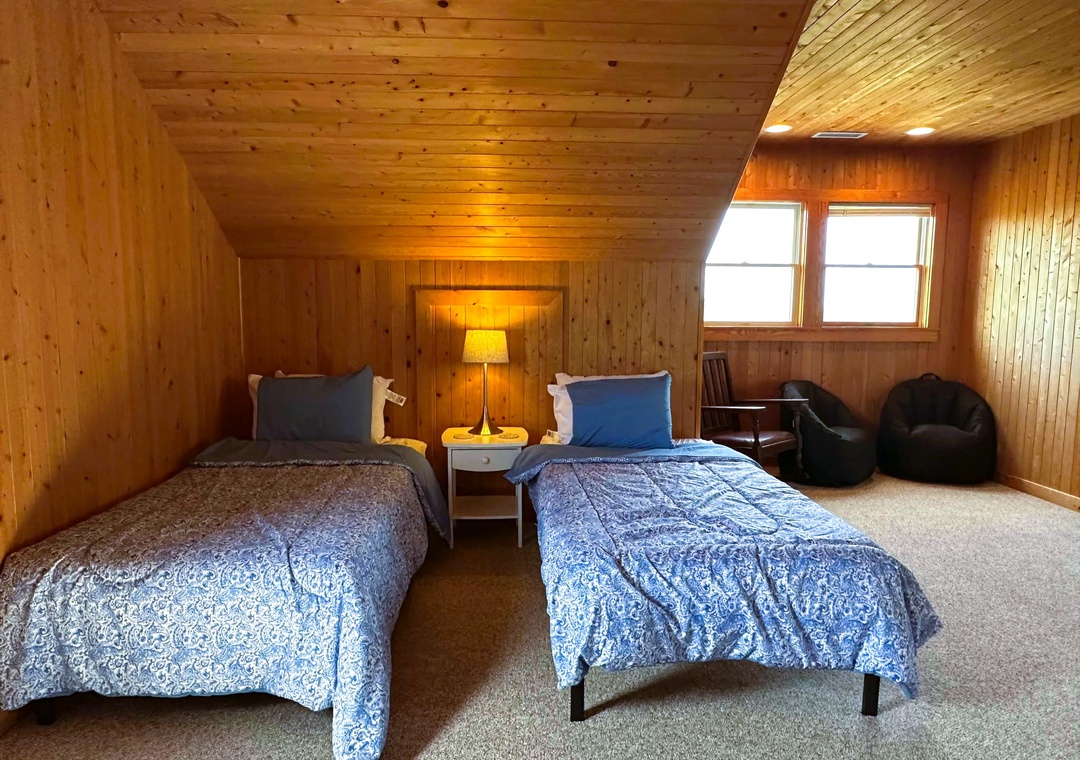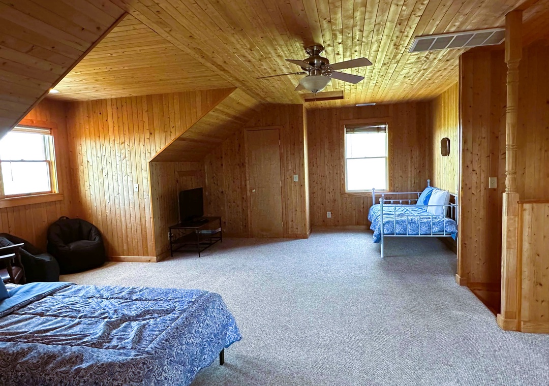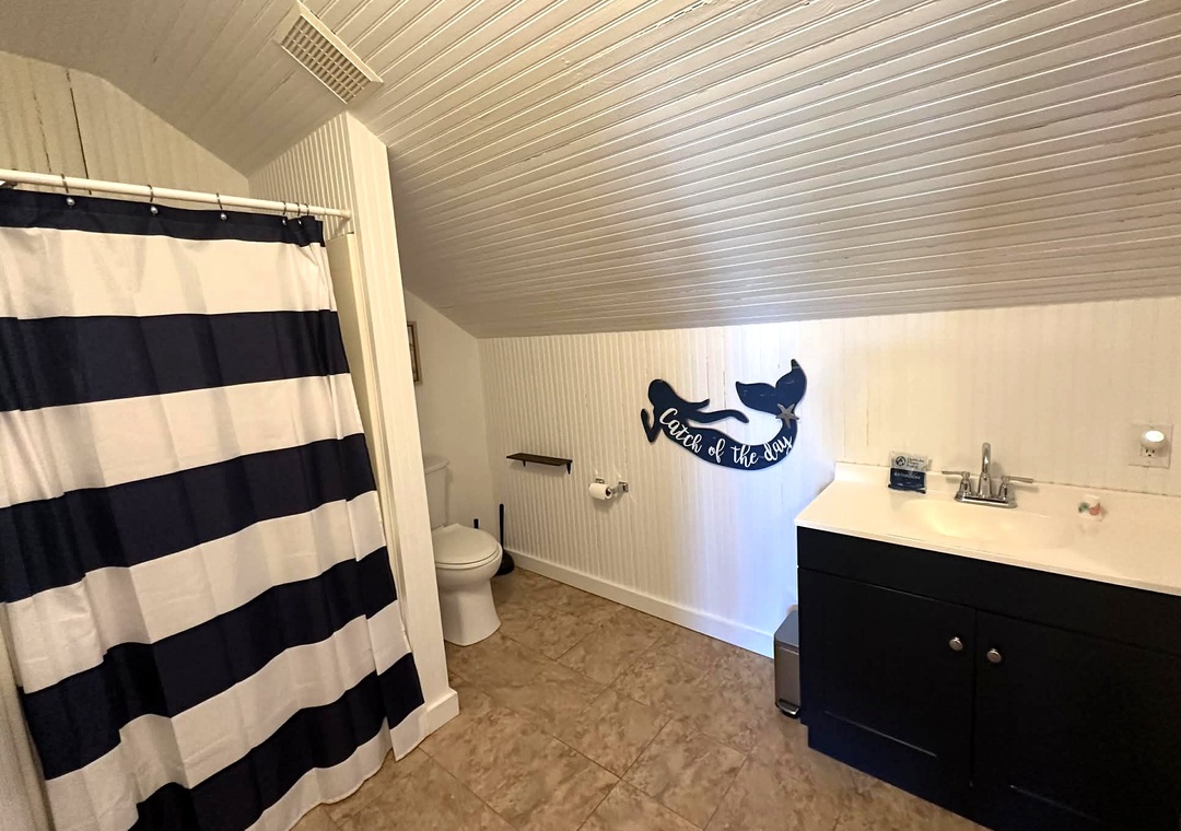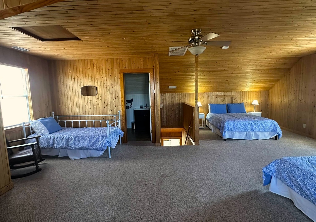 Second Floor: Large bedroom with Queen, Two Twins, and Daybed. Full bath with Shower only.