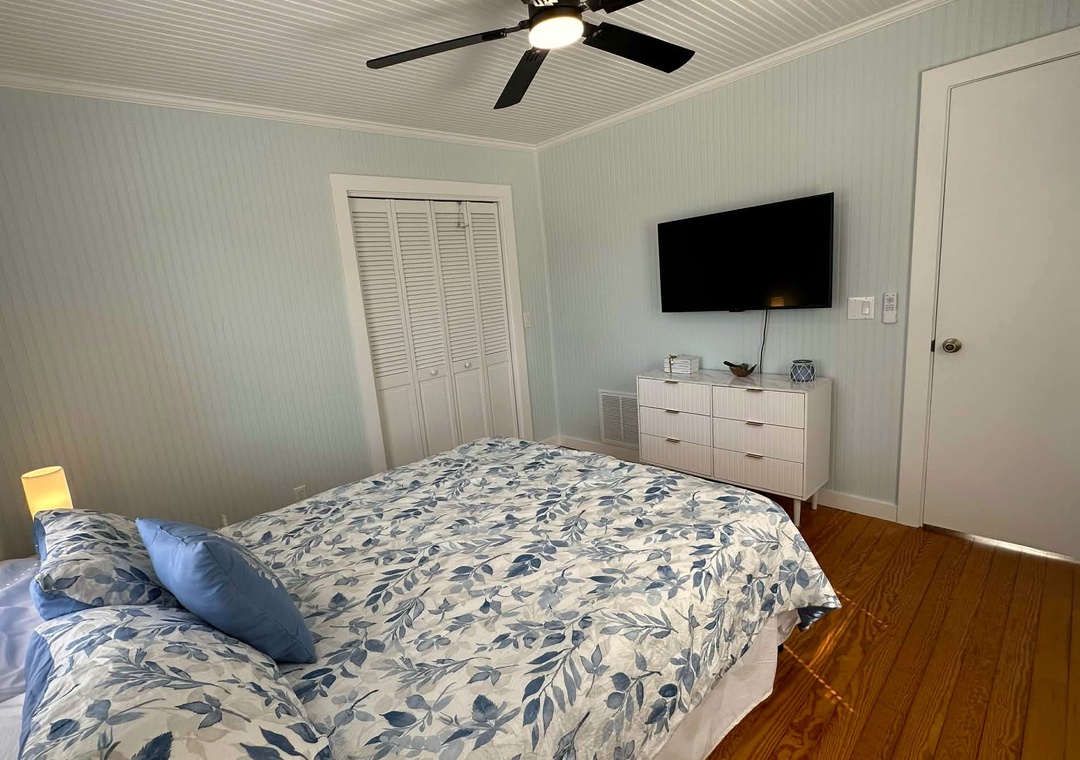 First Floor: Open kitchen and living area with TV. Queen Bedroom with TV. Full Bath with Tub and Shower.