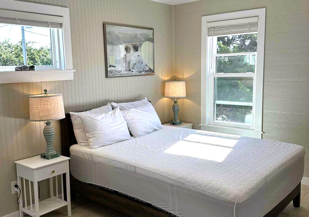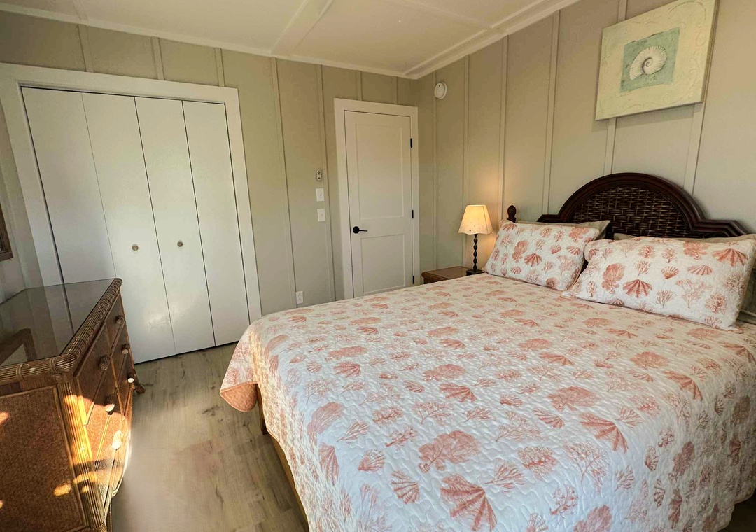 Sea Esta Downstairs is a charming vacation rental offering a cozy space right on the canal. The downstairs unit features two comfortable queen-sized bedrooms and a full bath with tiled shower.