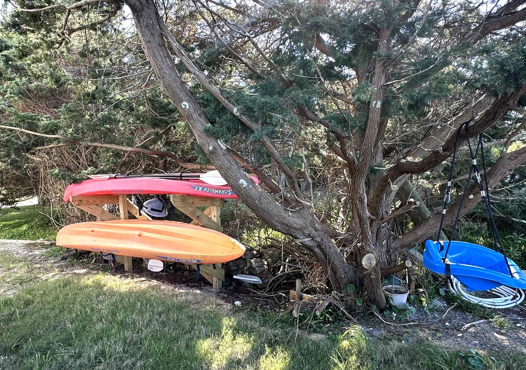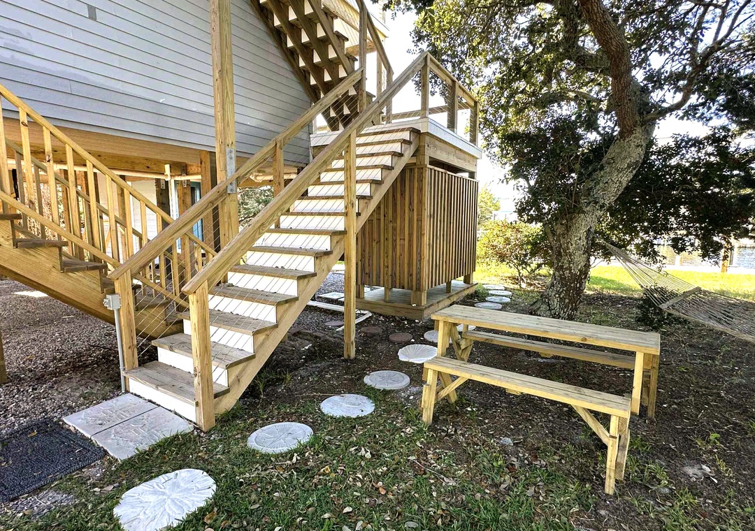 The exterior offers outdoor shower, boat slip, fish cleaning bench, kayaks (1 single, 1 double), charcoal park style grill, picnic tables, and hammock. All are shared with the upstairs unit OC79.