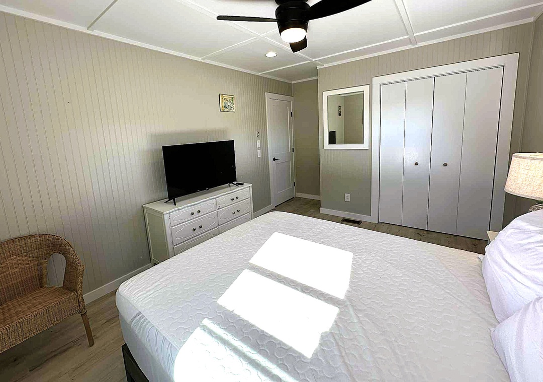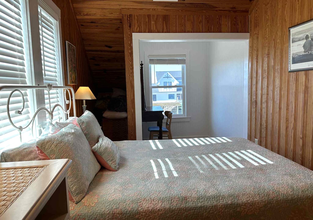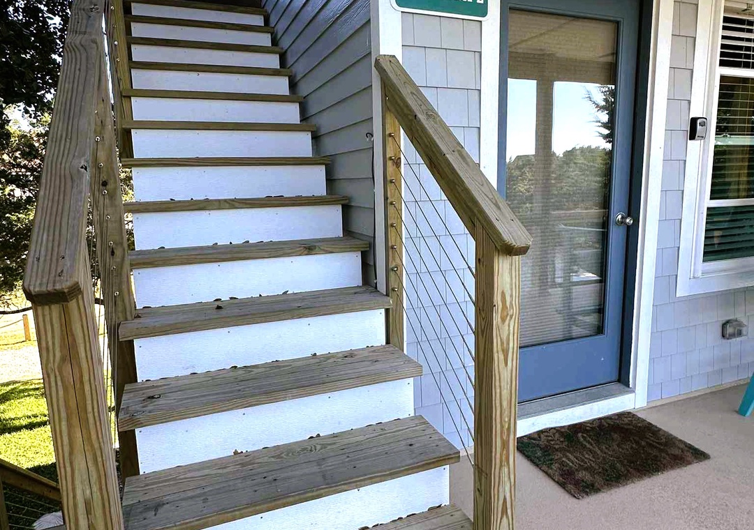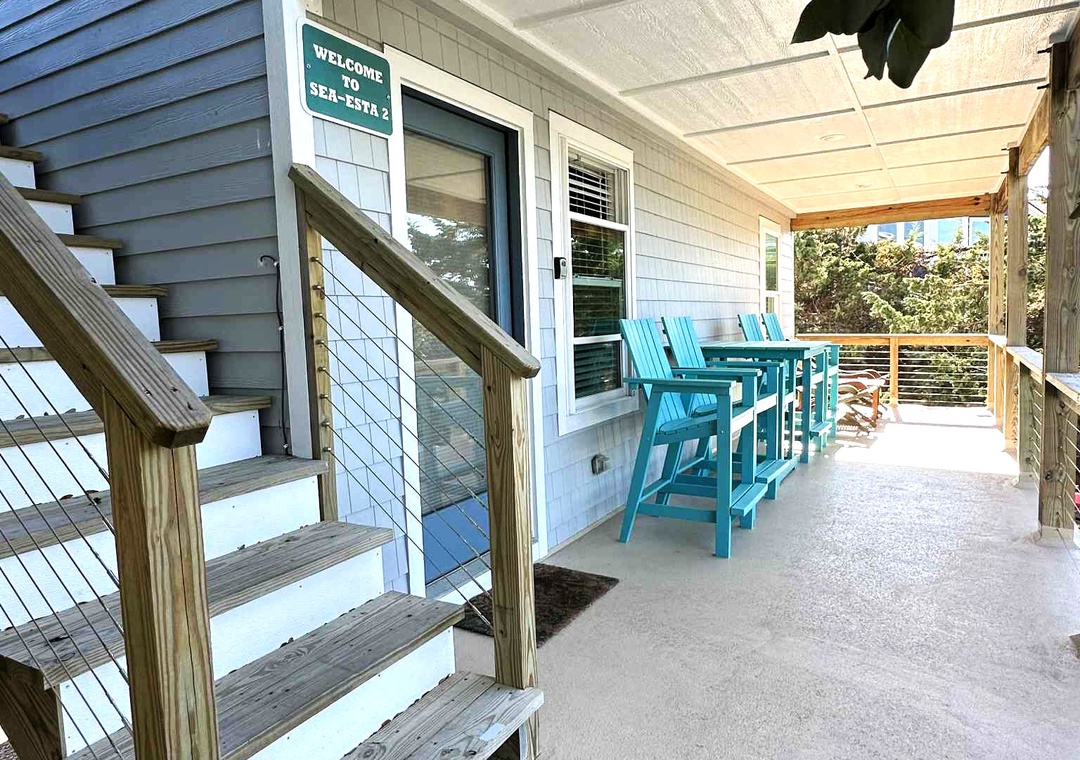 Sea- Esta three queen bedrooms, two full bathroom with tiled shower, 2 living areas, and 2 kitchens. There is an exterior private deck with adirondack furniture.