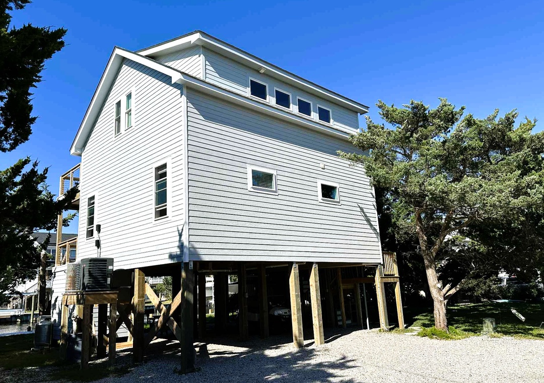 The exterior offers outdoor shower, boat slip, fish cleaning bench, kayaks (1 single, 1 double), charcoal park style grill, picnic tables, and hammock. All are shared with the downstairs unit OC78.