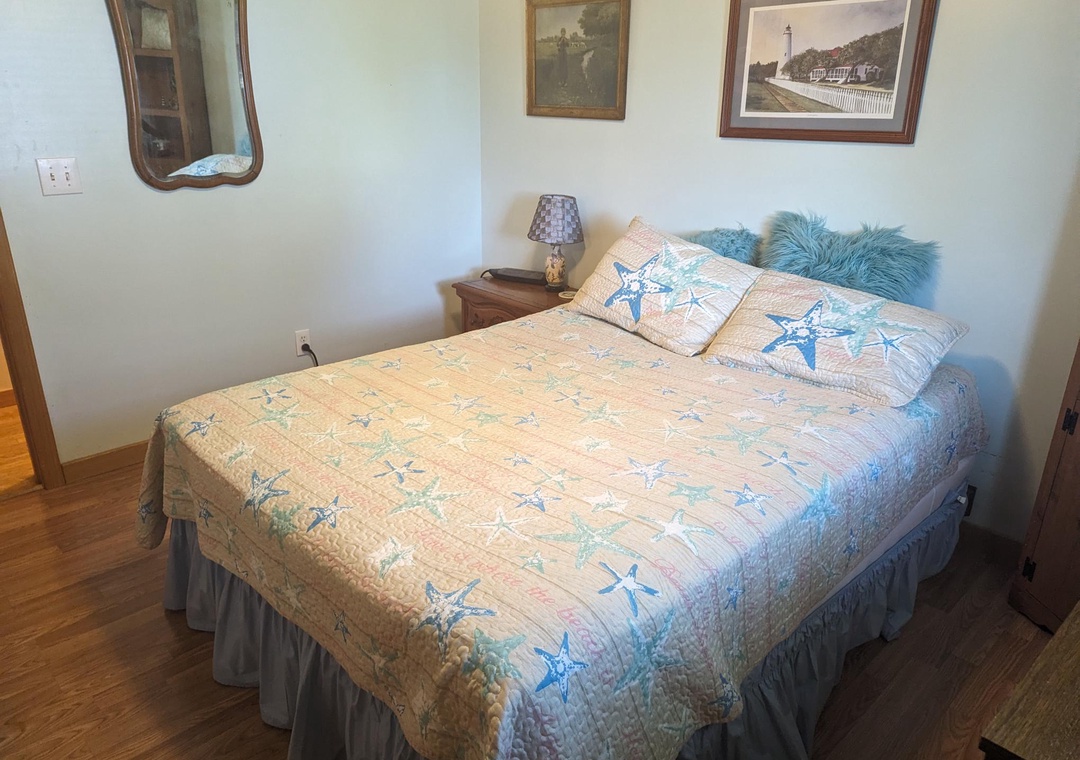 The home offers three bedrooms: a primary bedroom with a queen bed, a second bedroom with a queen bed, and a third bedroom with a double bed. Each room includes coastal-inspired décor and adequate closet space. There are two full bathrooms—one with a tub and shower combination, and one with a shower.