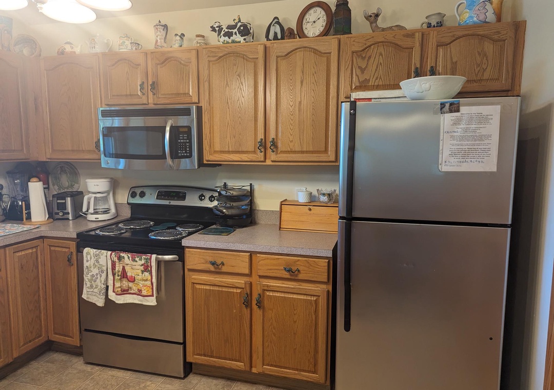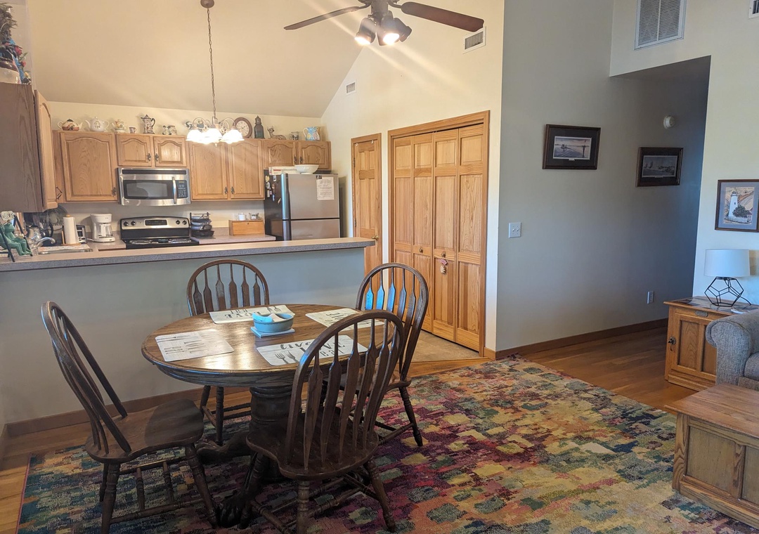 The fully equipped kitchen includes stainless steel appliances and the essentials for preparing meals at home, from simple snacks to full dinners. The adjacent dining area seats six.