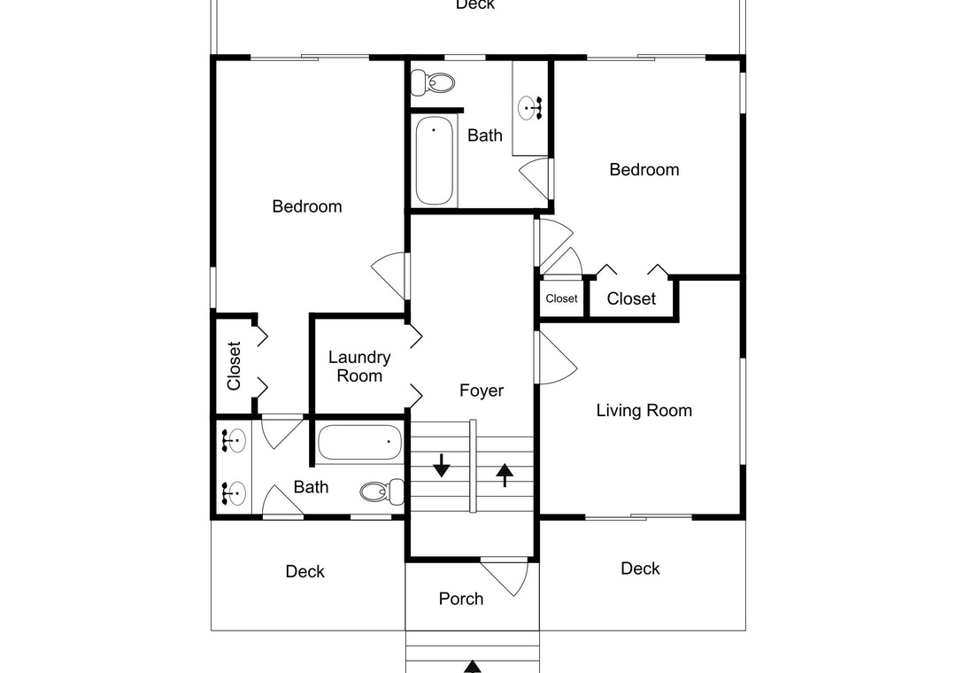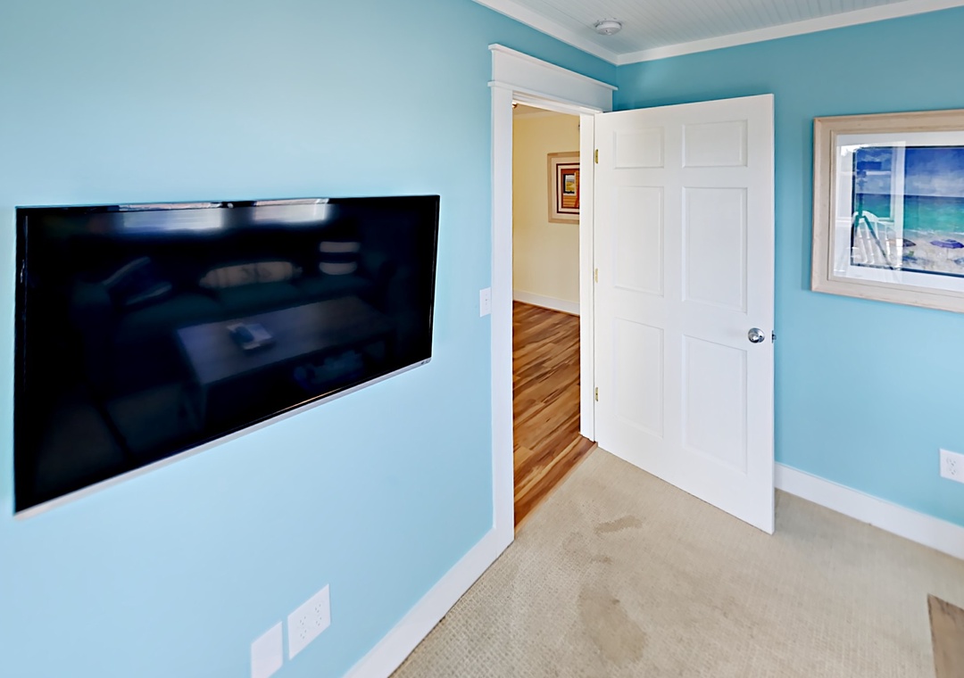 First Floor: Primary Bedroom with King bed, TV, and Primary Bath with tub/shower. Primary Bedroom with two Twin beds, TV, and Primary Bath with tub/shower. Den with TV/DVD, and Queen Sleeper Sofa. Hallway Laundry Closet.