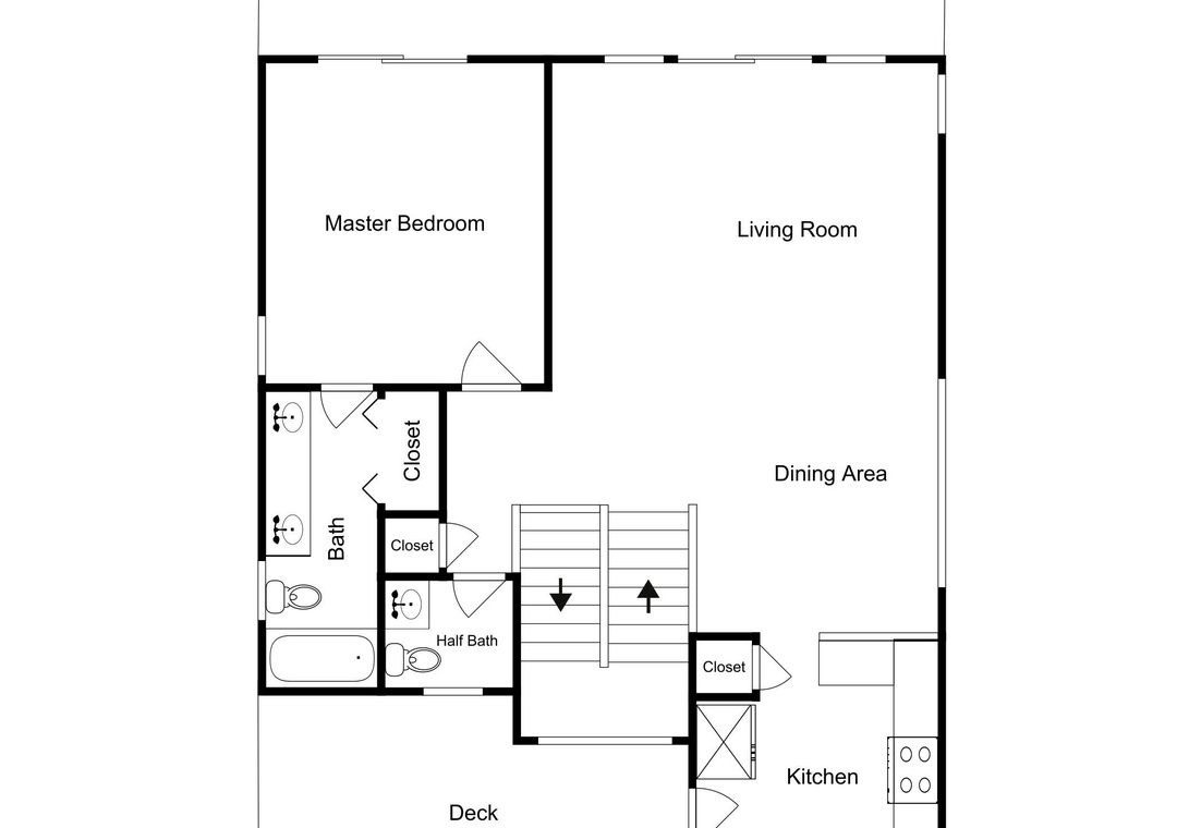 Second Floor: Open kitchen, dining and living area with TV/DVD. Primary Bedroom with King bed, TV, and Primary Bath with tub/shower. Half Bathroom.