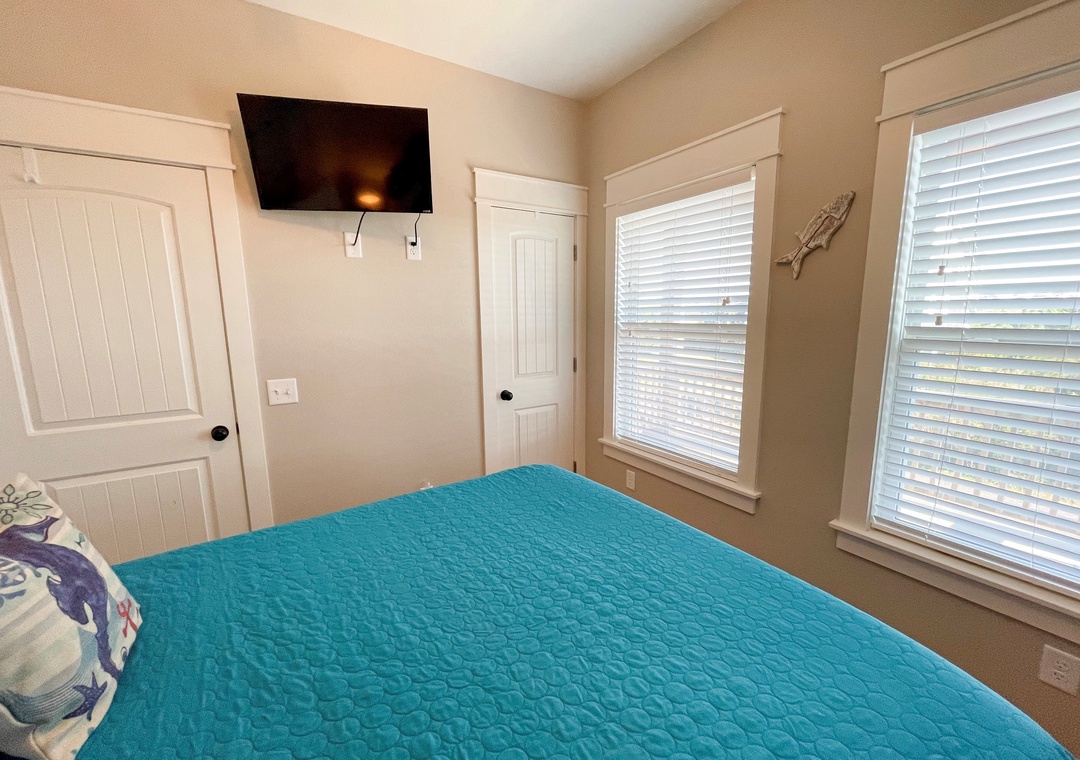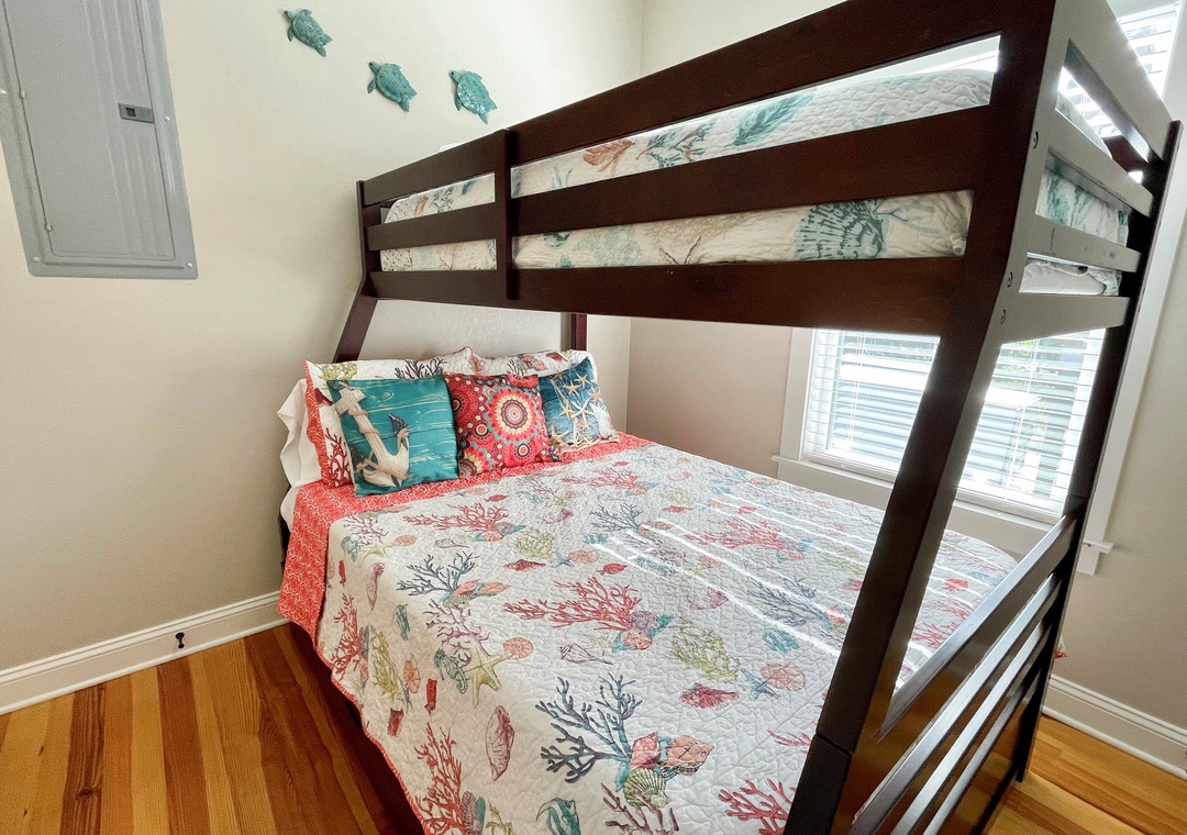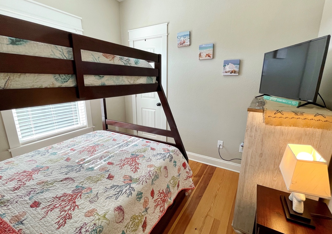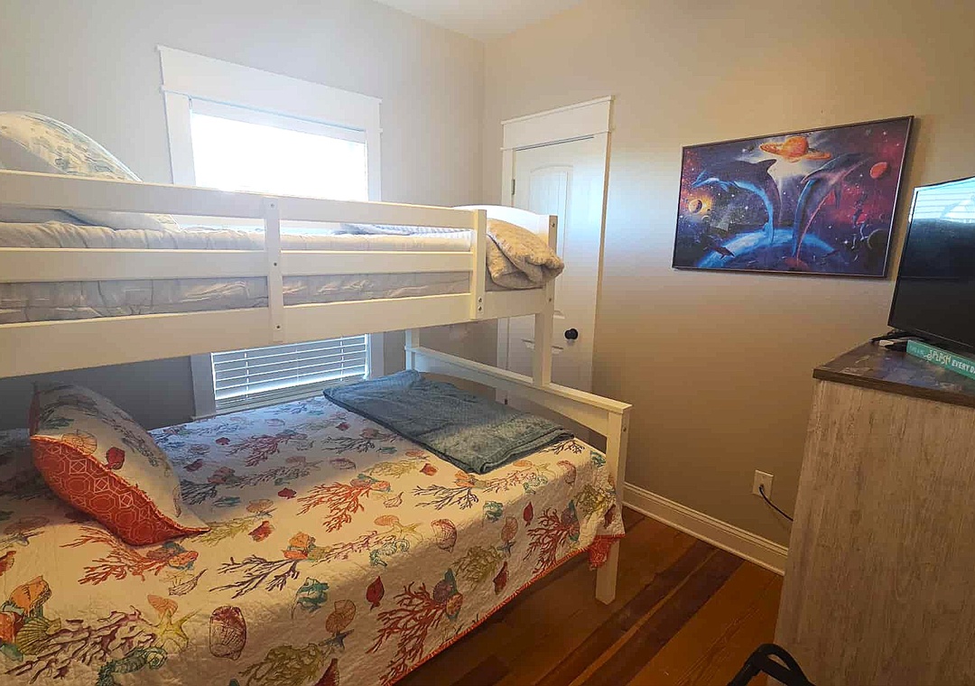 First Floor: Primary Bedroom with King Bed, TV and private Primary Bath with shower. Bedroom with Queen Bed and TV. Bedroom with Pyramid Bed (Double on bottom/Twin on top) and TV. Hallway Bath with tub/shower.
