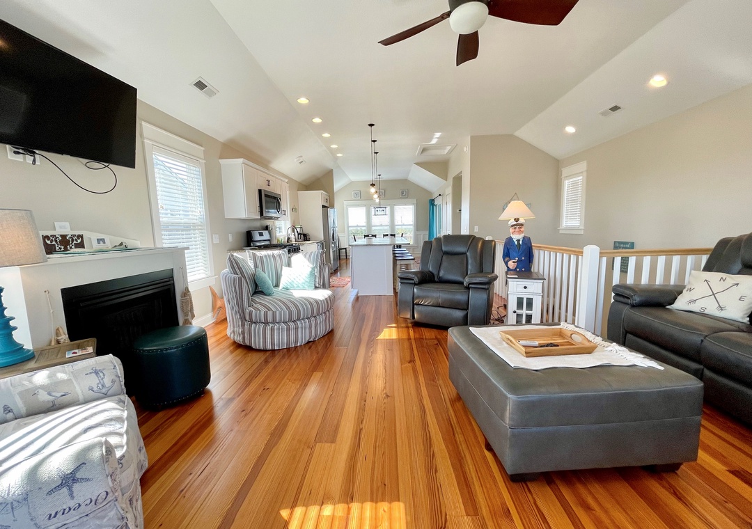 Second Floor: Open kitchen, dining and living area with TV. Half Bath.