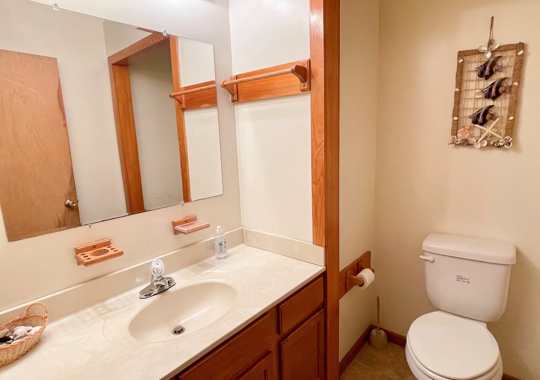 First Floor: Living Room with TV/VCR/DVD. Open kitchen and dining area. Primary Bedroom with King bed and Primary Bath. Half Bath. Laundry Room with washer/dryer and upright freezer.