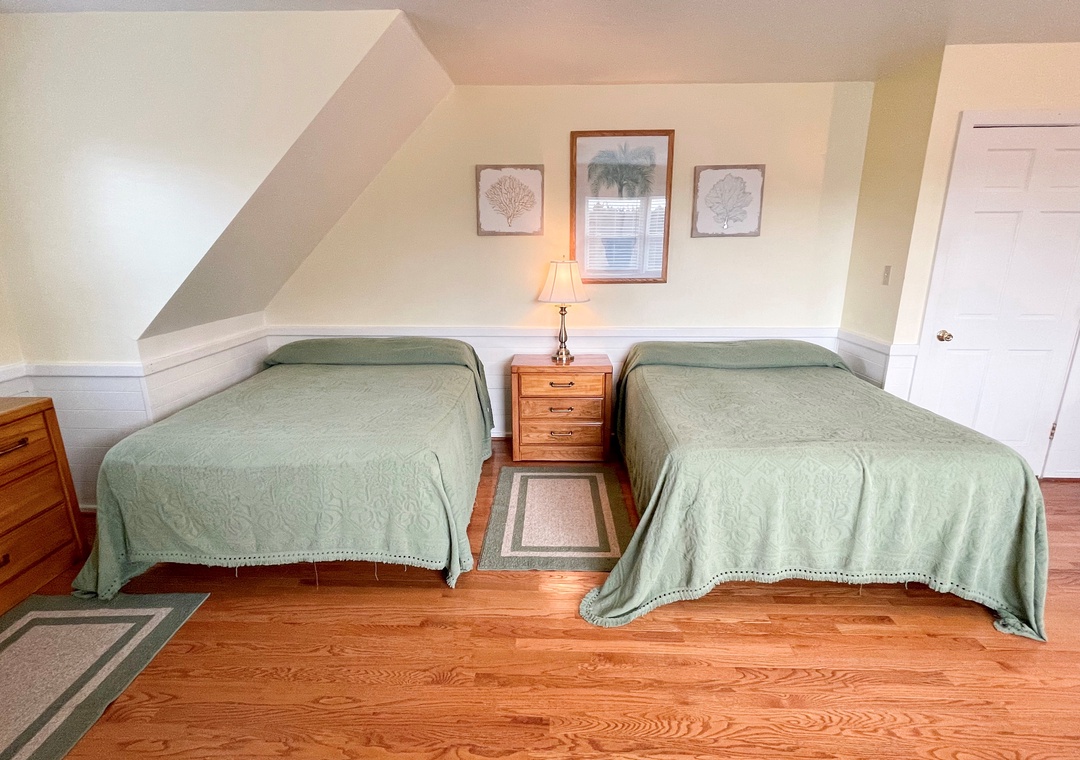 3 Bedrooms, 2.5 Baths: First floor bedroom with King. Second floor 1 bedroom with King, 1 with two Doubles and Twin.