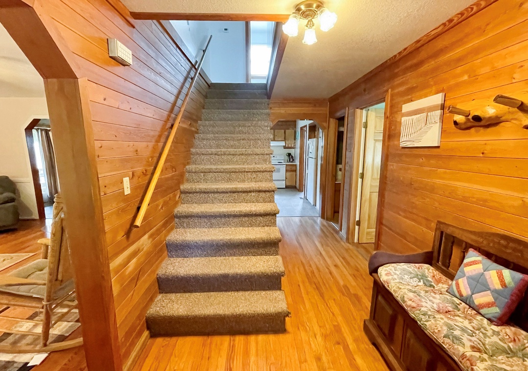 Second Floor: Bedroom with King bed, TV. Bedroom with two Double beds, TV. Full Bath with tub/shower.