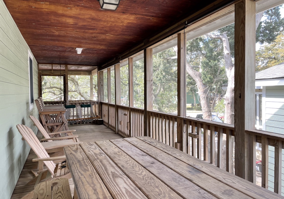 The exterior offers covered front porch, a large screened porch, hammock, hammock swing, hot/cold outdoor shower, park style charcoal grill and fish cleaning bench.