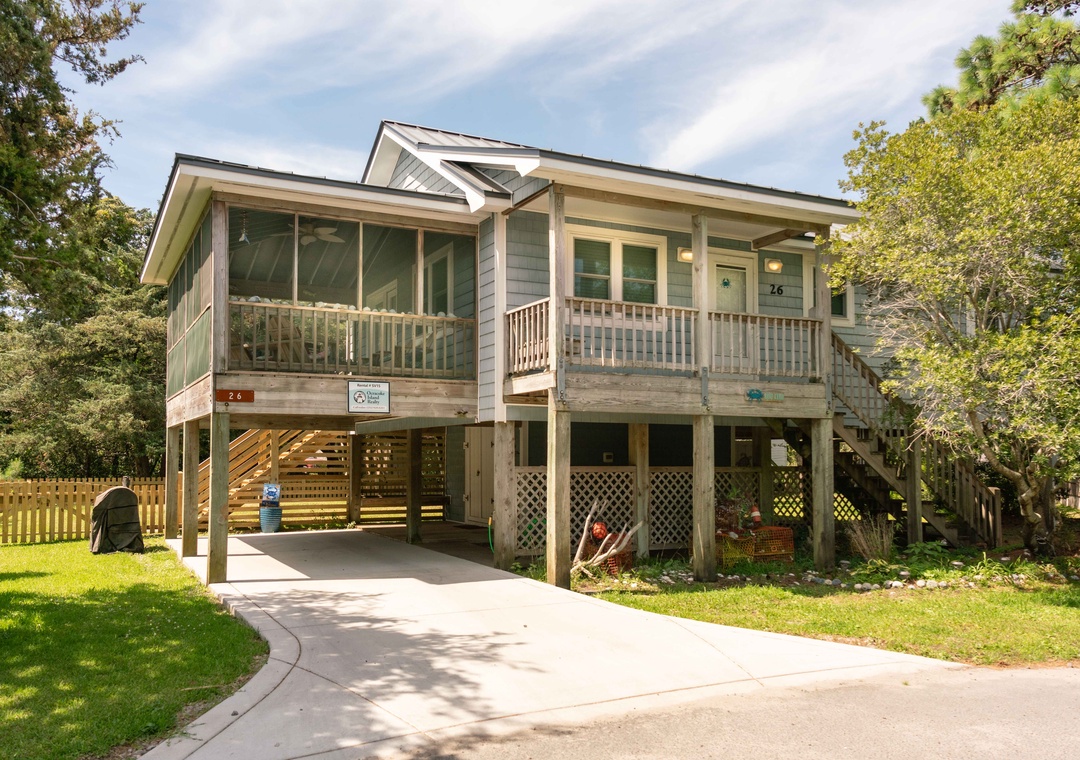 This Ocracoke Island vacation home is off the main road, but just around the corner from the coffee shop. Also near many interesting shops and restaurants. Relax on the spacious screened porch. A great choice for 2 couples. Blue Crab features a spacious open floor plan and vaulted ceilings.