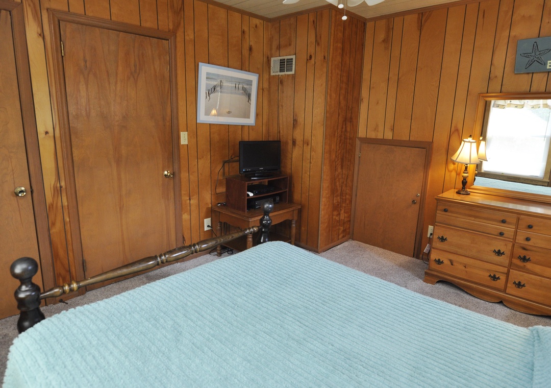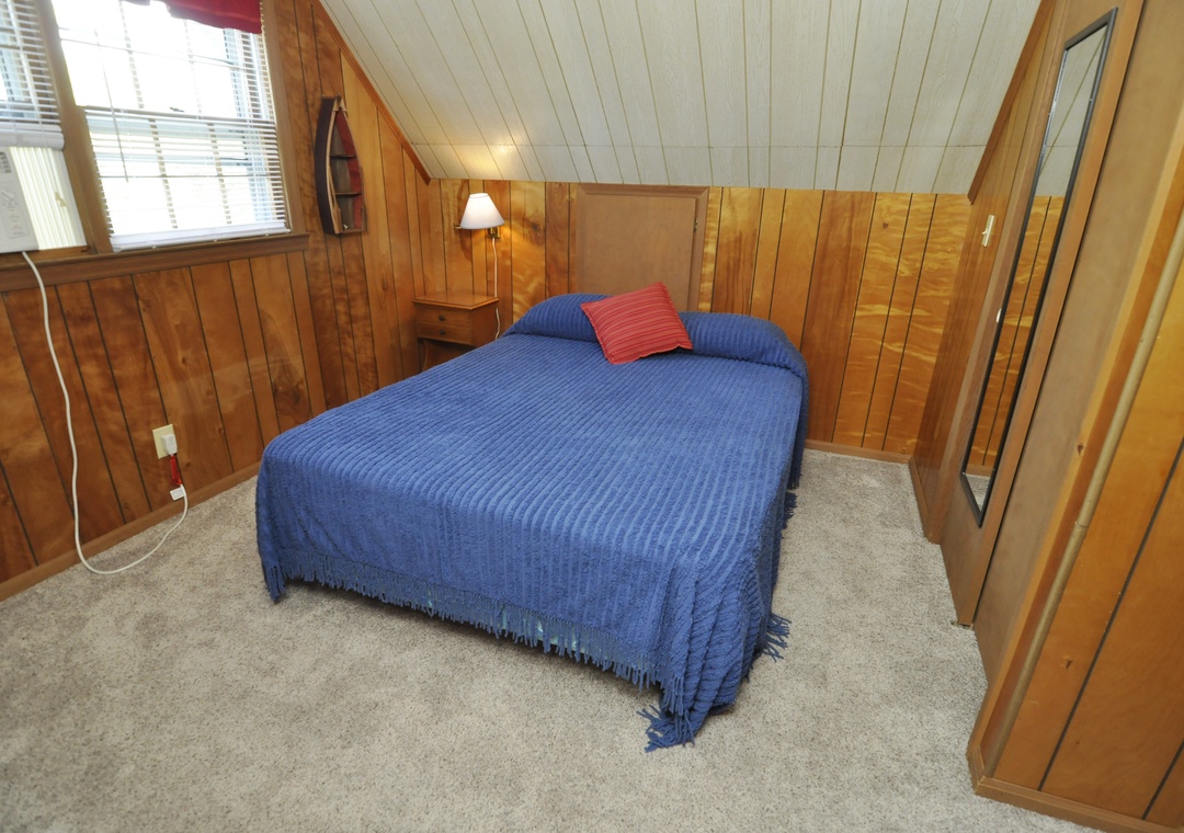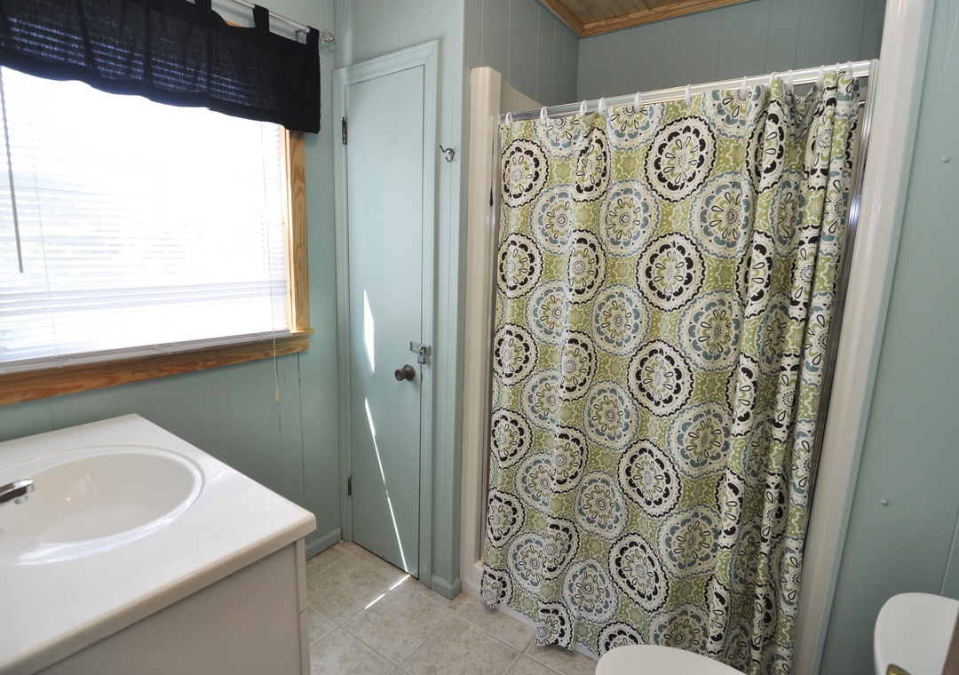 First Floor: Open kitchen, dining and living area with TV. Bedroom with Queen bed, TV. Hallway Bath with shower only.
