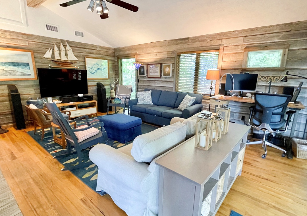This popular Ocracoke vacation cottage is great for family vacations or couples. Raised above ground level, this cottage offers both an exterior stairway and an access ramp for easy access and wheel chair accessibility. Enjoy the convenient walking distance to the Ocracoke Coffee Company, restaurants, Silver Lake Harbor, Village shops and the library. Bad day for the beach ~ the spacious great room features a state of the art home theater with a 65 inch 4K OLED screen, Pioneer Elite components, surround-sound speakers, and an AppleTV, with a movie collection of over 1,000 titles and HBO. Need to check in with work ~ the house boasts the fastest internet available Starlink Satellite internet land and a notebook desk with a 27" 4K monitor.