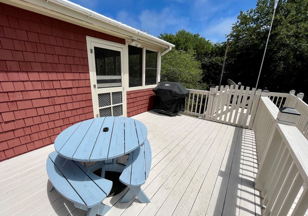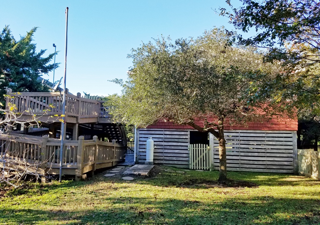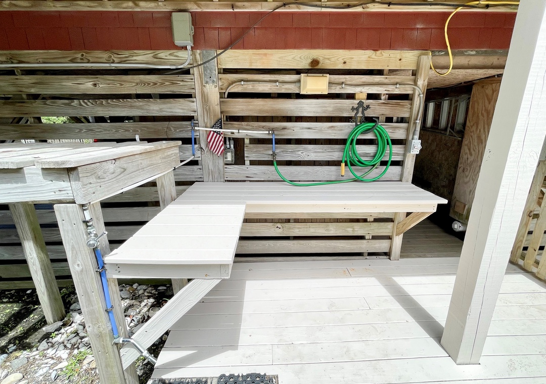 The exterior offers a screened porch with dining table and seating including a hammock swing. The spacious open deck offers a dining table with umbrella and gas grill. The rear yard offers a hammock perfect for relaxion and a park style charcoal grill. Fish cleaning bench, large sheltered outdoor hot/cold outdoor shower, foot shower, and a bike rack. Fenced rear yard with convenient access via the gated deck and parking area.