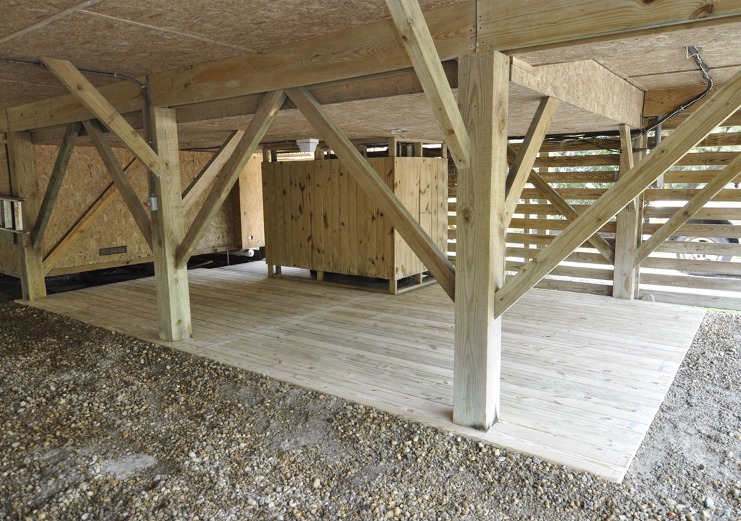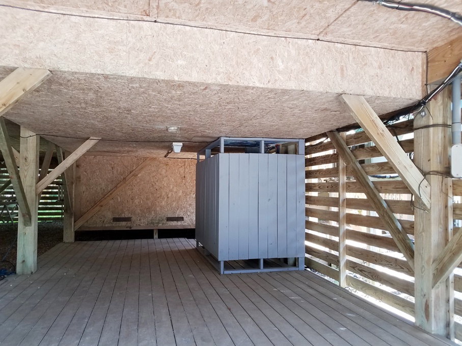 Boat storage/covered parking is available underneath the house, in the left bay with a clearance of approximately 6 foot 10 inches. The right bay offers a large outdoor shower and platform designed for loading/unloading items and wheelchairs. This platform provides access to the home's entry ramp. The right side bay is not available for vehicle or golf cart parking. Additional vehicle parking is available outdoors.