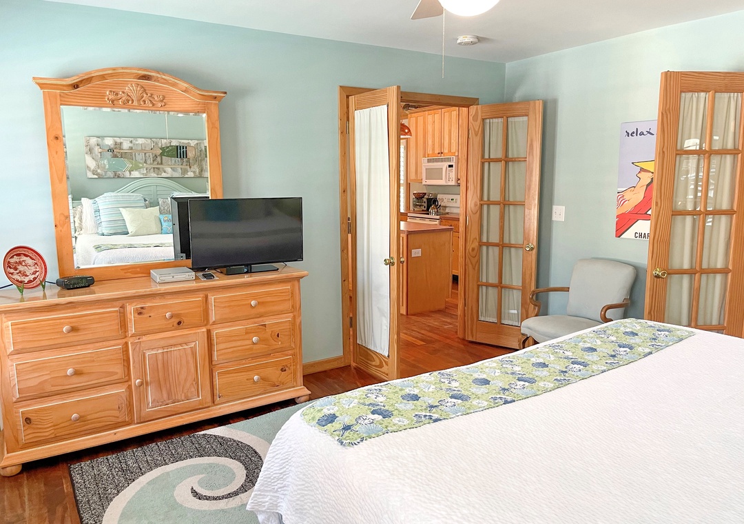 Single Story Cabana: Open kitchen, dining and living area with TV. Master Bedroom with King bed, TV, and Master Bath with oversized tub/shower.