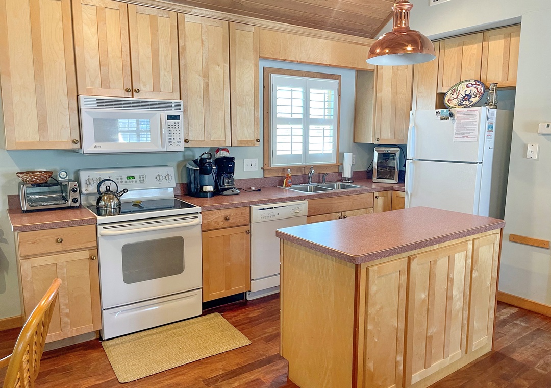 Amenities include an electric fireplace (off season only), cathedral wood ceiling, central air conditioning/heat, 2 smart TVs and Starlink satellite internet. The kitchen offers a Keurig K-Cup and standard coffee maker.