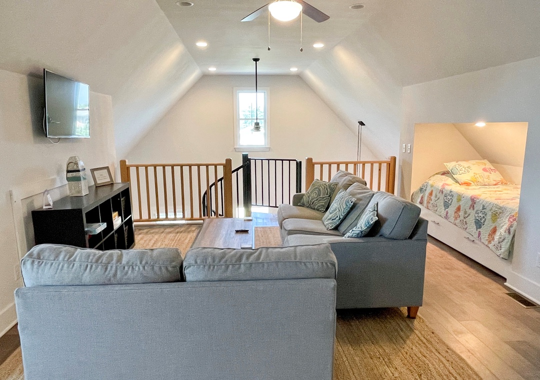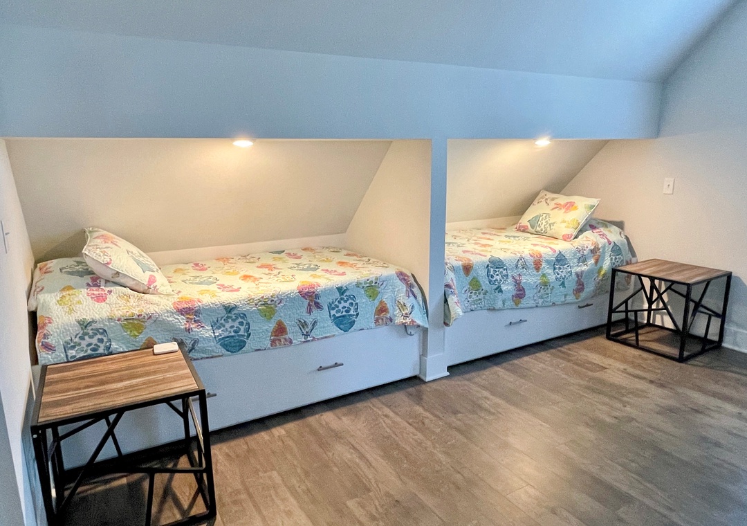 Second Floor: Sleeping Loft with three Twin Beds, Den Seating and TV. Bath with Tub/Shower.