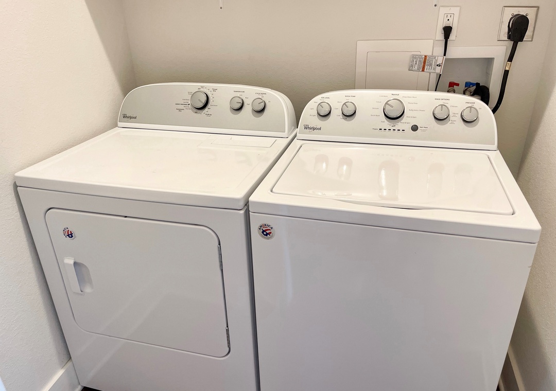 First Floor: Open living area with TV, dining and kitchen. Primary Bedroom with King Bed, TV and Private Bath with tiled shower. Two bedrooms each with a Queen Bed and TV. Hallway Bathroom with Tub/Shower. Hallway Laundry Closet with Washer/Dryer.