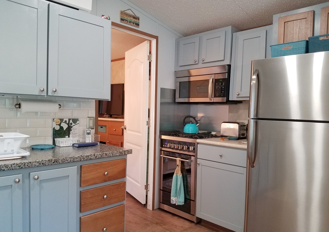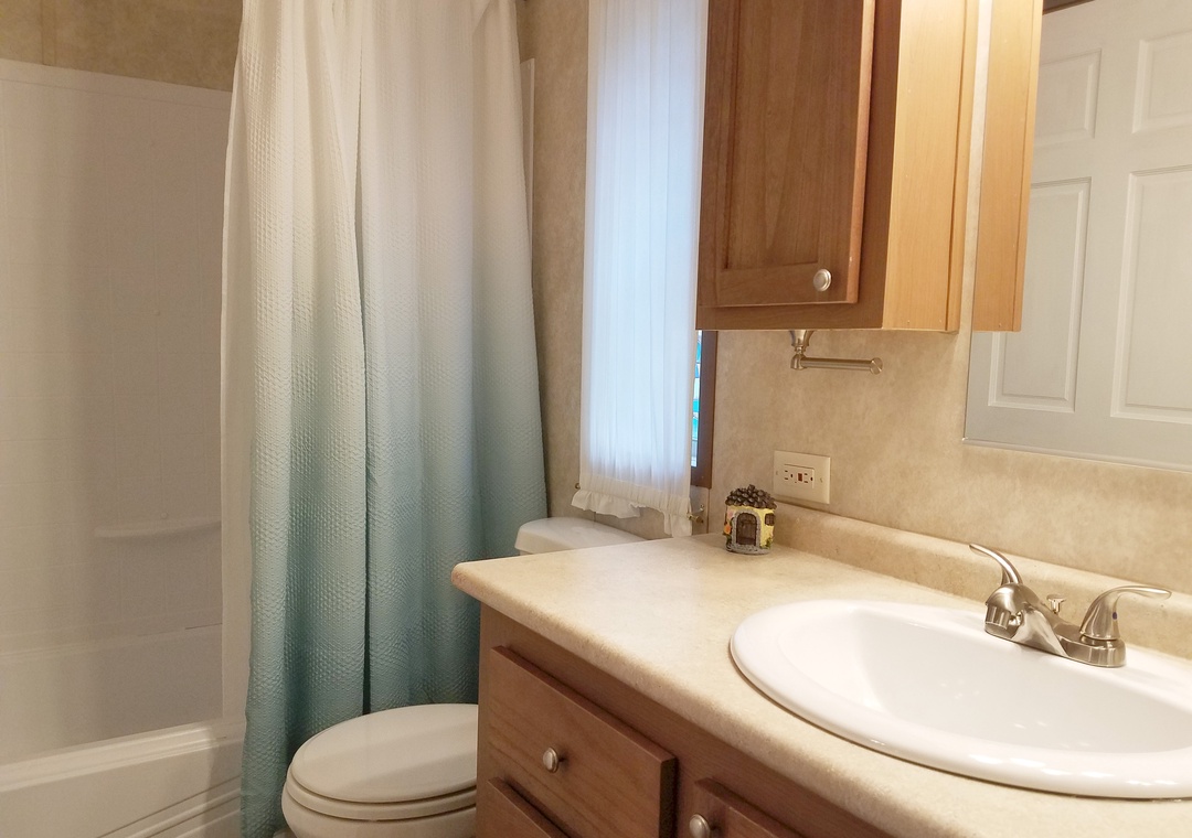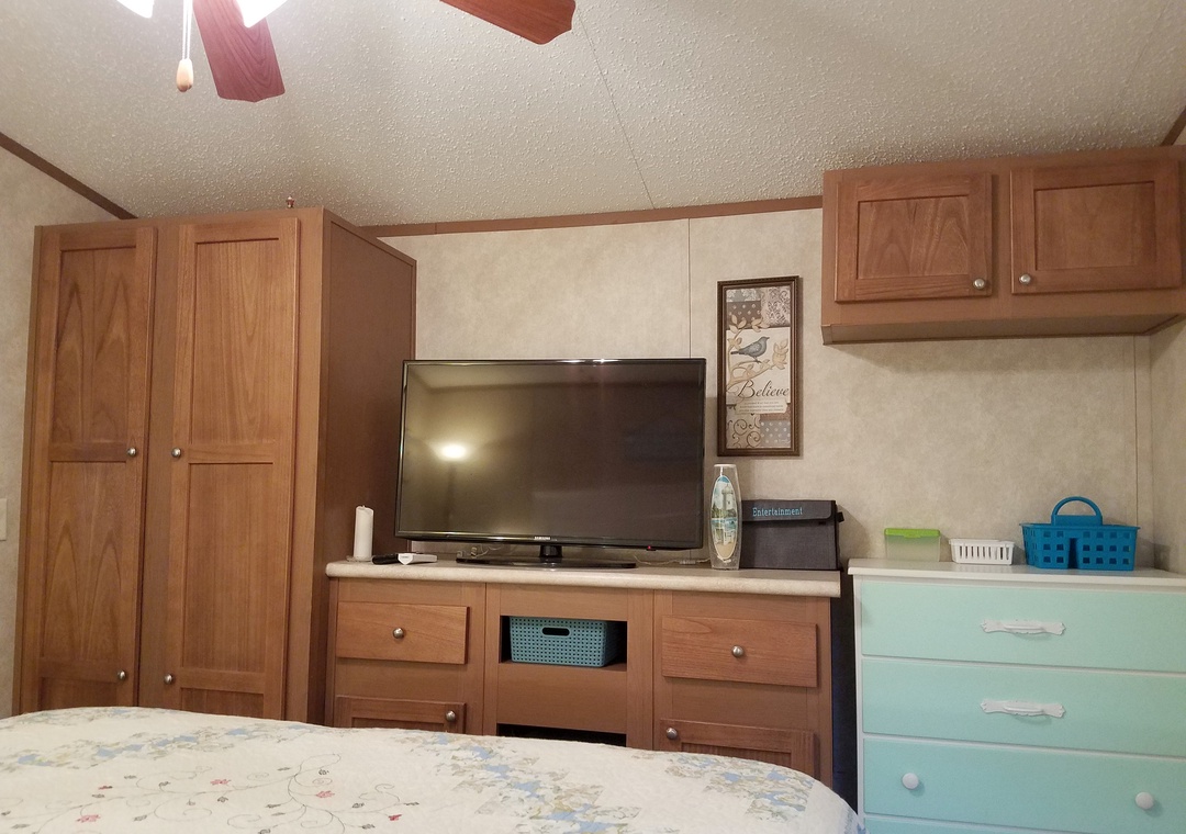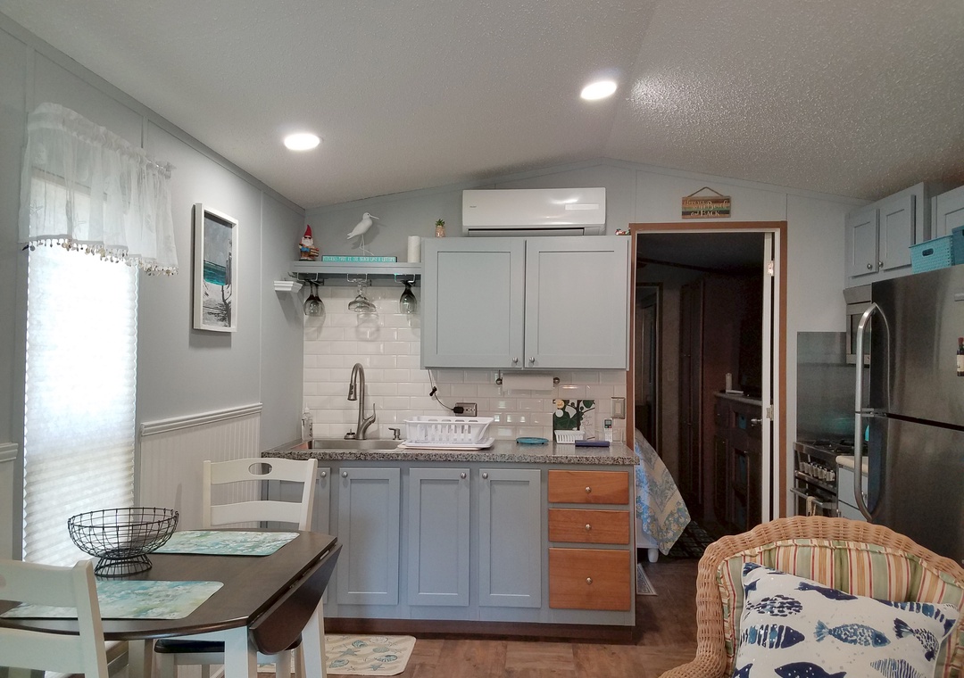 This tiny home offers an open floor plan, Primary Bedroom with Queen bed and private bath. Queen Sleeper Sofa with 5" memory foam mattress in the Living Room.
