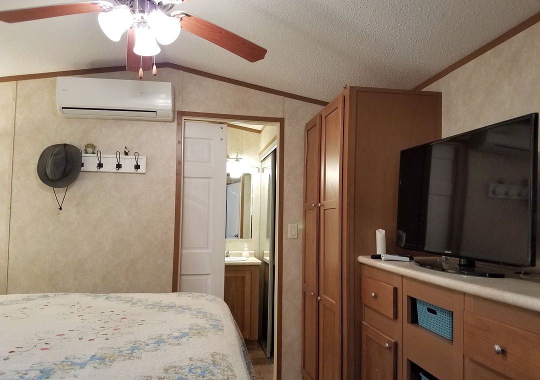 Open floor plan with Kitchen, Dining and Living Area with TV and Queen Sleeper Sofa. Primary Bedroom with TV and Full Bath with tub/shower and stack washer/dryer.