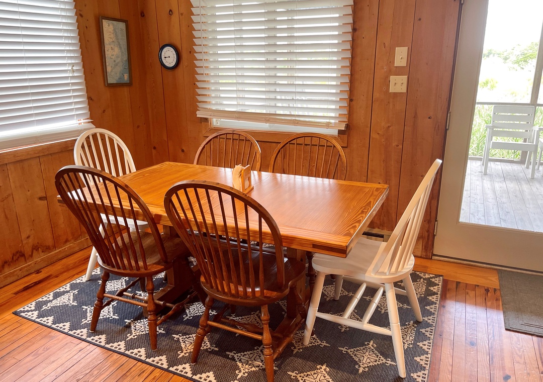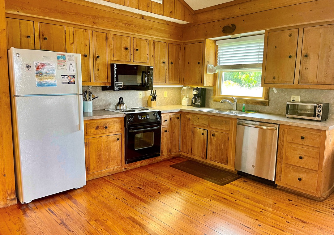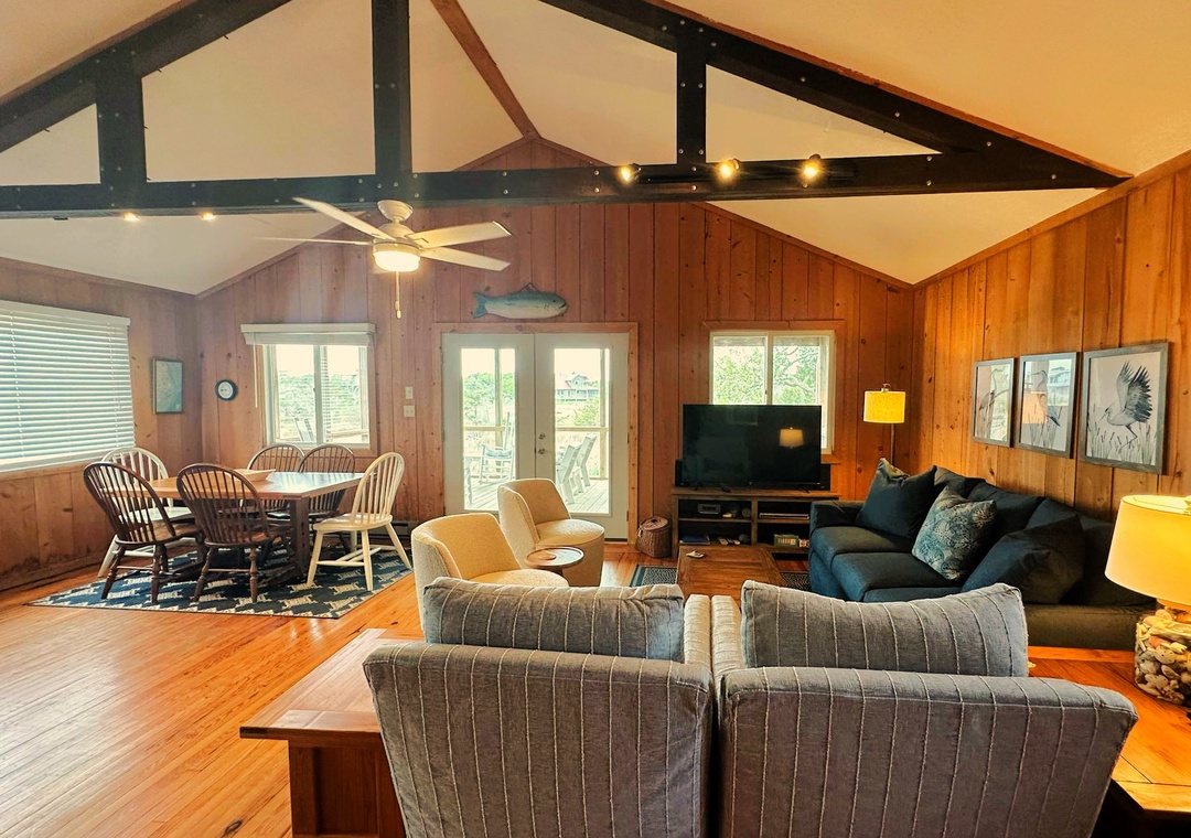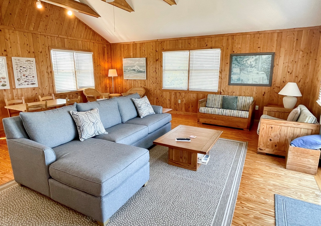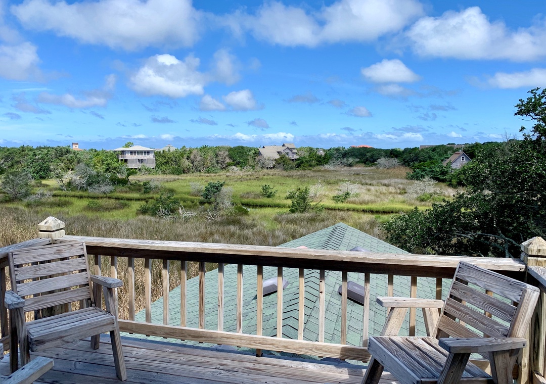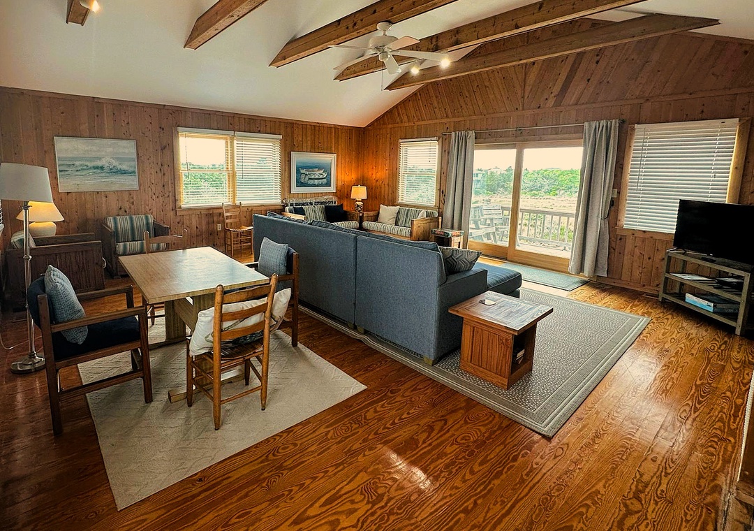 This Ocracoke Island cottage offers beautiful marsh views. Ford Cottage features a first floor open floor plan. The open kitchen, dining and living areas offer a great space for family gatherings or entertaining. The first floor is further enhanced by a generous screened porch and deck. Lovely pine floors throughout. The second floor features a great room with cathedral ceilings, wet bar with mini refrigerator, half bath, and a balcony providing a wonderful view of the marsh.