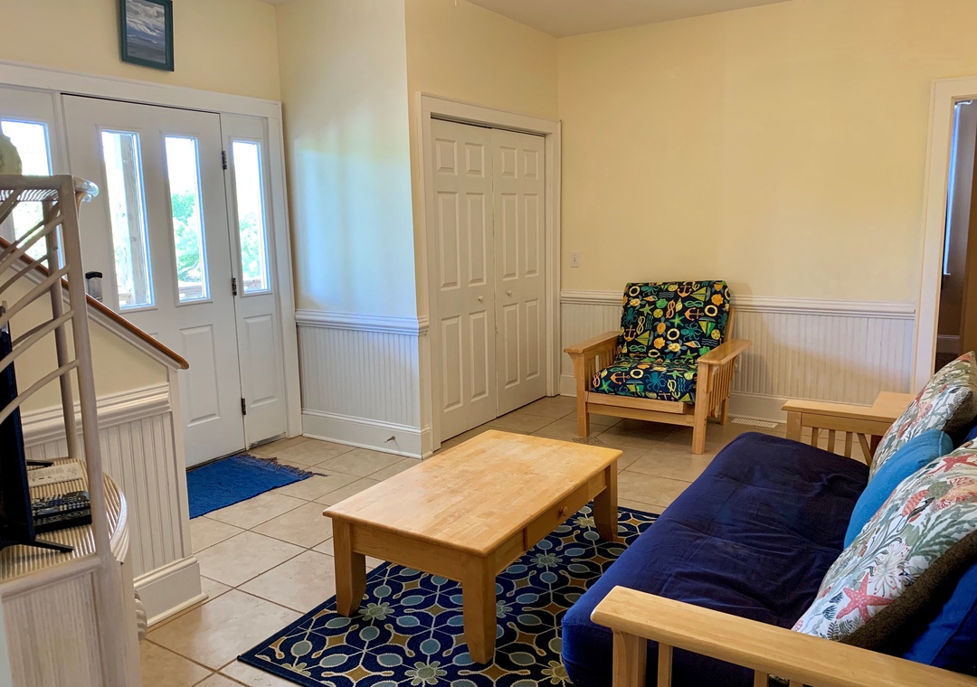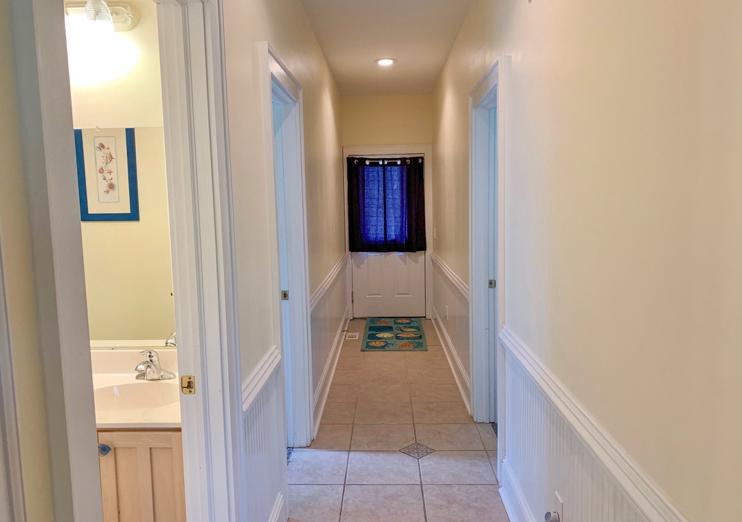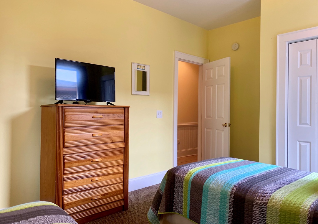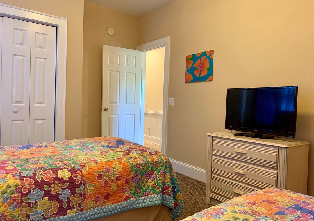 First Floor: Primary Bedroom with Queen bed, TV, and Primary Bath with whirlpool tub and separate shower. Two Bedrooms, each with two Twin beds, and TVs. Entry Sitting Area. Bath with tub/shower. Laundry Closet.