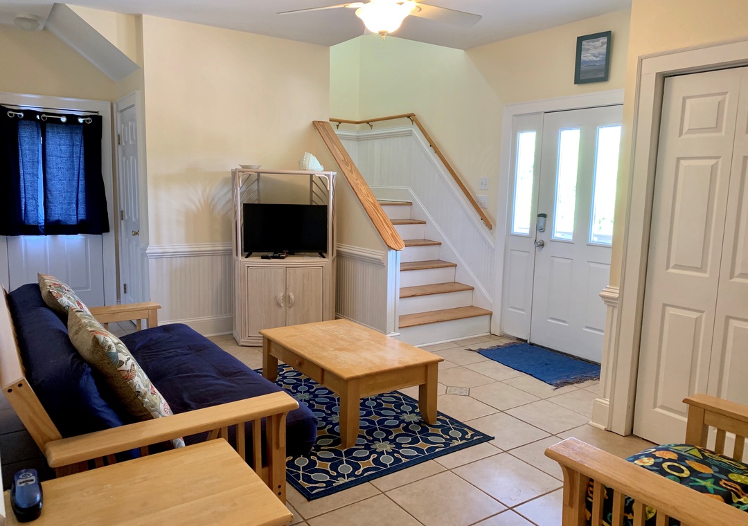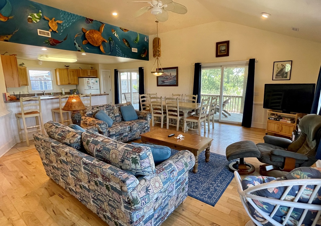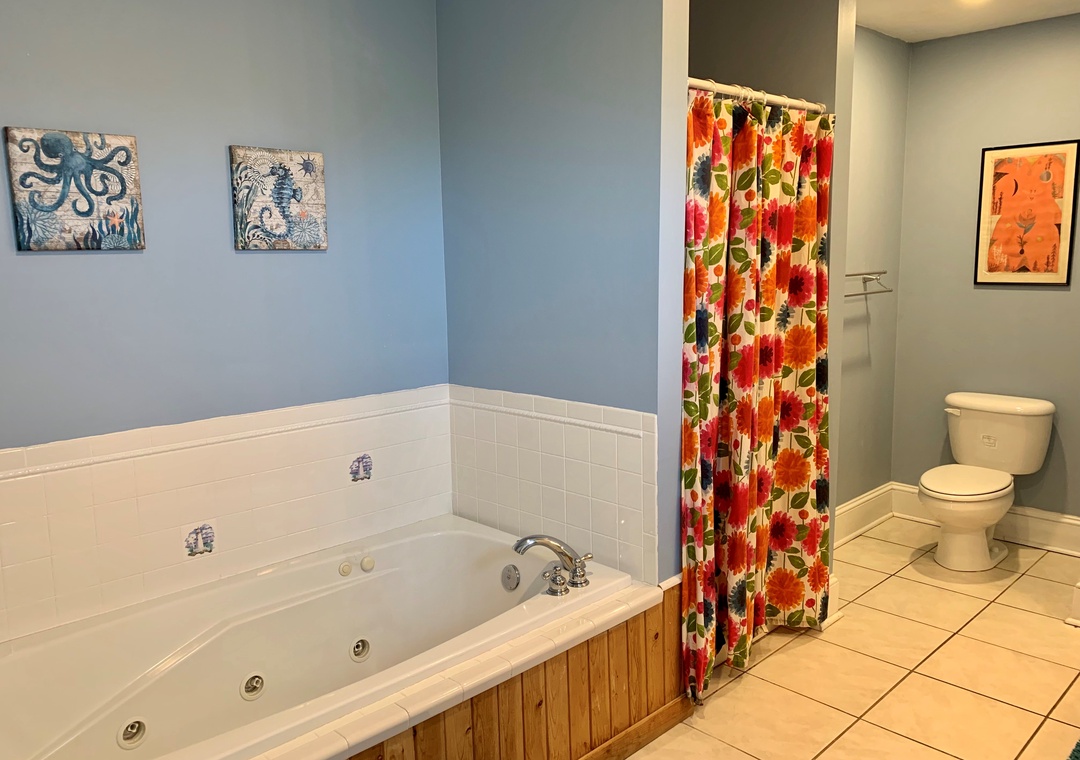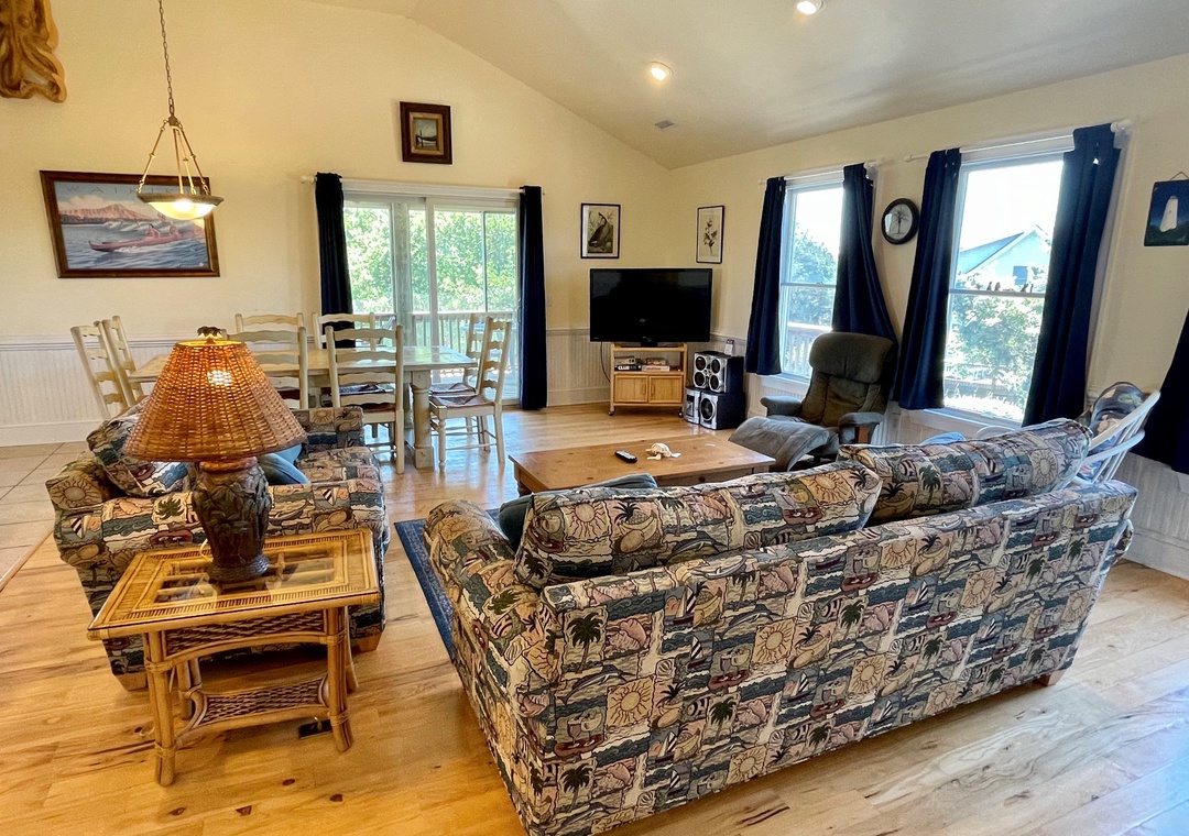 Second Floor: Open kitchen, dining and living area with TV. Primary Bedroom with King bed, TV, and Primary Bath with whirlpool tub and separate shower. Half Bath.