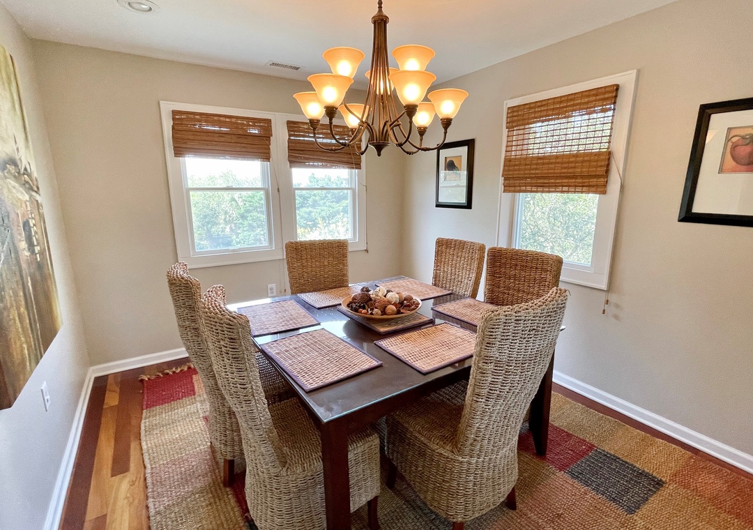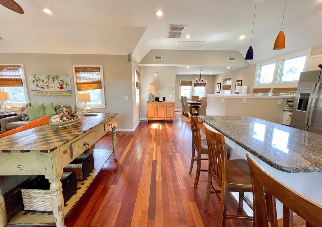 This island gem is located on a quiet cul-de-sac. Professional interior decorating is stunning but relaxed. This reverse floor plan is ideal for families with children or multi-family groups. The second floor open great room, dining and kitchen areas are bright and inviting. Fully-stocked kitchen has stainless appliances and granite countertops. The formal dining room, casual bar seating, and screened porch with patio table provide varied options for dining.