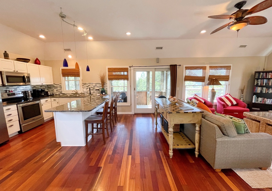 Second Floor: Open kitchen, dining and living area with TV. Double size Sleeper Sofa in living area. Bath with tub/shower.