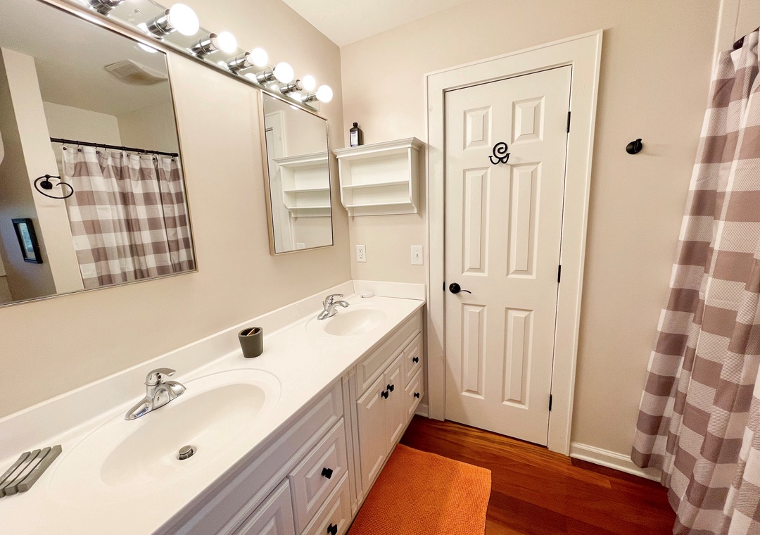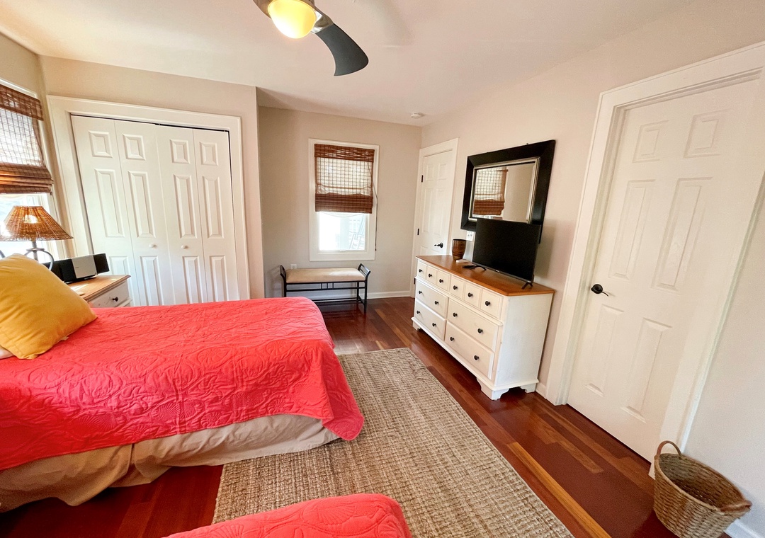First Floor: Primary Bedroom with King bed, TV, and Primary Bath with shower only. Bedroom with 1 king bed, TV. Bedroom with 2 Twin beds, TV. Bath with shower. Laundry Closet.