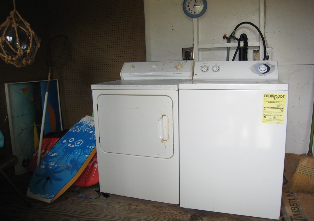 The washer/dryer is located down a walkway, in the outdoor laundry and guest storage shed.