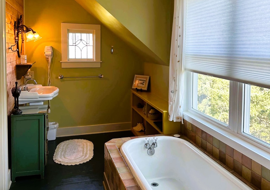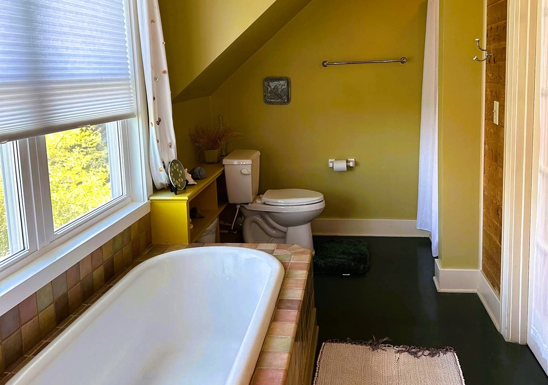 Second Floor: Primary bedroom with king bed and primary bath with soaking tub and separate shower. Primary bedroom with king bed and private half bath.