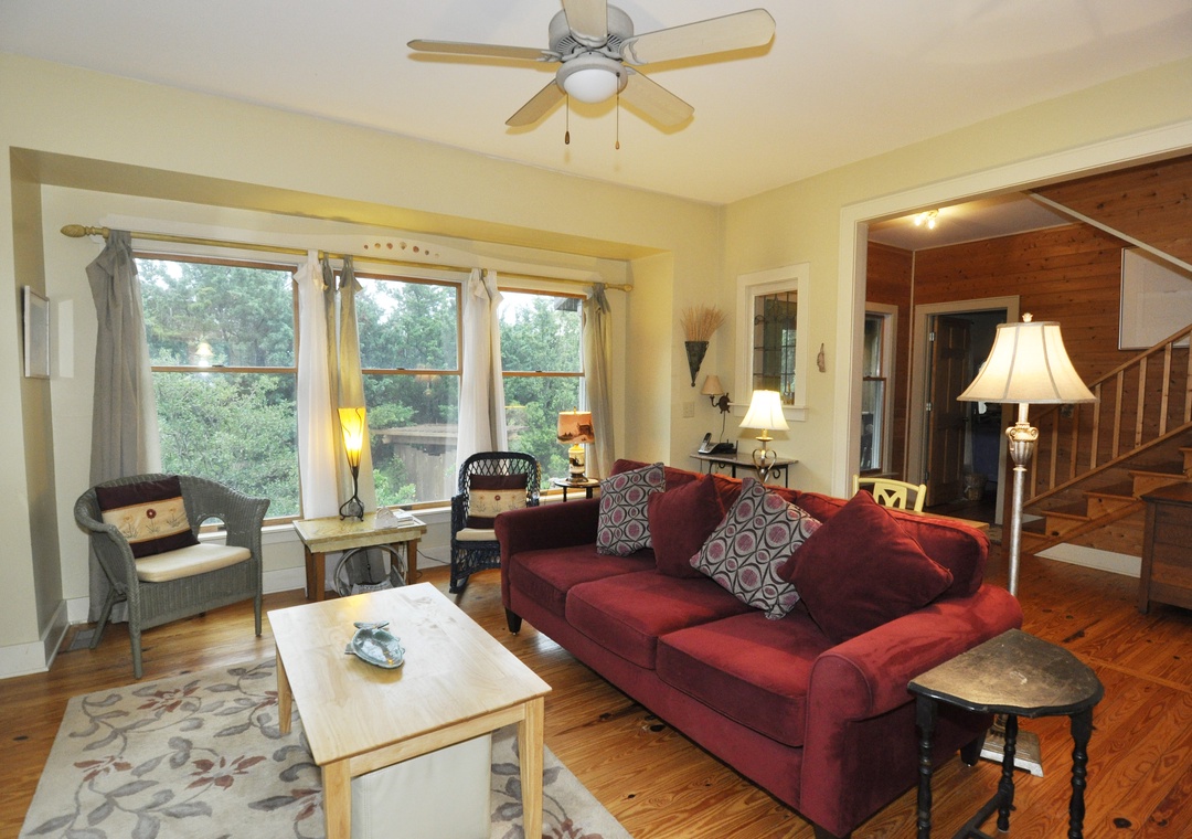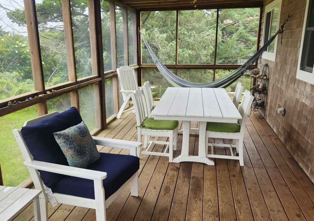 Outside, there is a covered front porch, a screened back porch with a dining table and chairs and a hammock for lounging, a second-floor deck to catch the afternoon sun, and a lookout deck on the roof. Hot/cold outdoor shower, fish cleaning station, park-style charcoal grill, café’ table with chairs, and a concrete picnic bench.