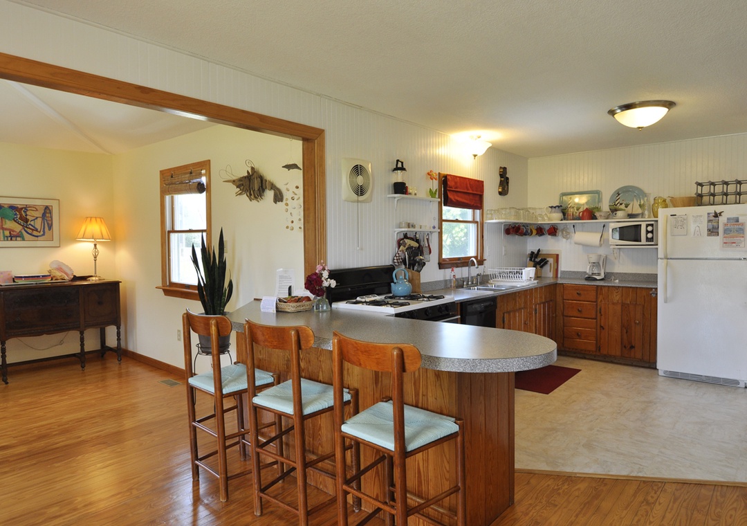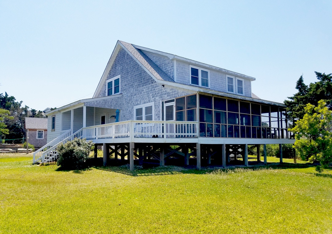 Simple, spacious and bright, Tolson House is a classic Ocracoke beach house. This sound front home offers a large waterside screened porch and deck, providing many magnificent sound and saltmarsh views. Whether watching the sunrise from the porch or bird watching from the waterside lawn, Tolson House offers a quiet relaxing location for your home away from home.