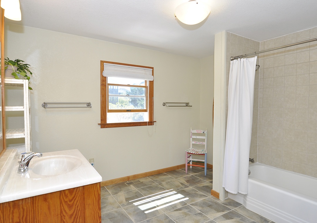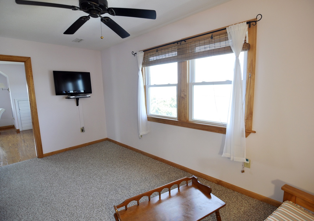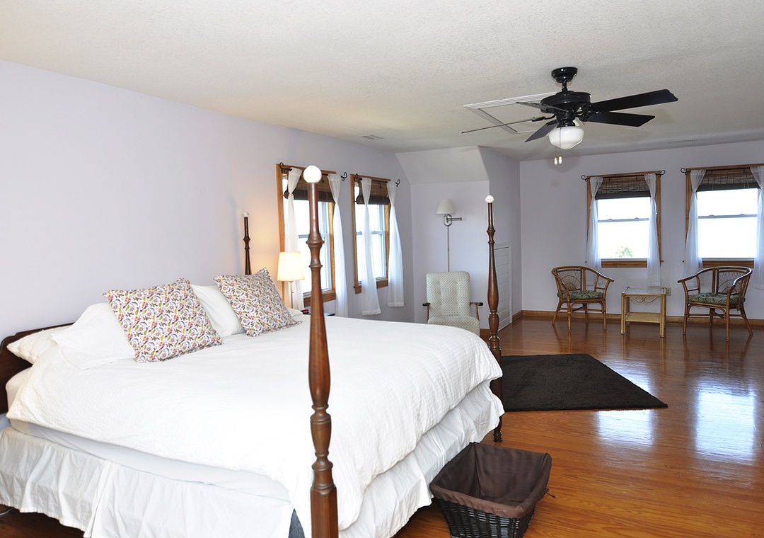Second Floor: Primary Bedroom with King bed and Primary Bath with shower. Bedroom with 1 twin and 1 double bed. Sitting Area with TV.