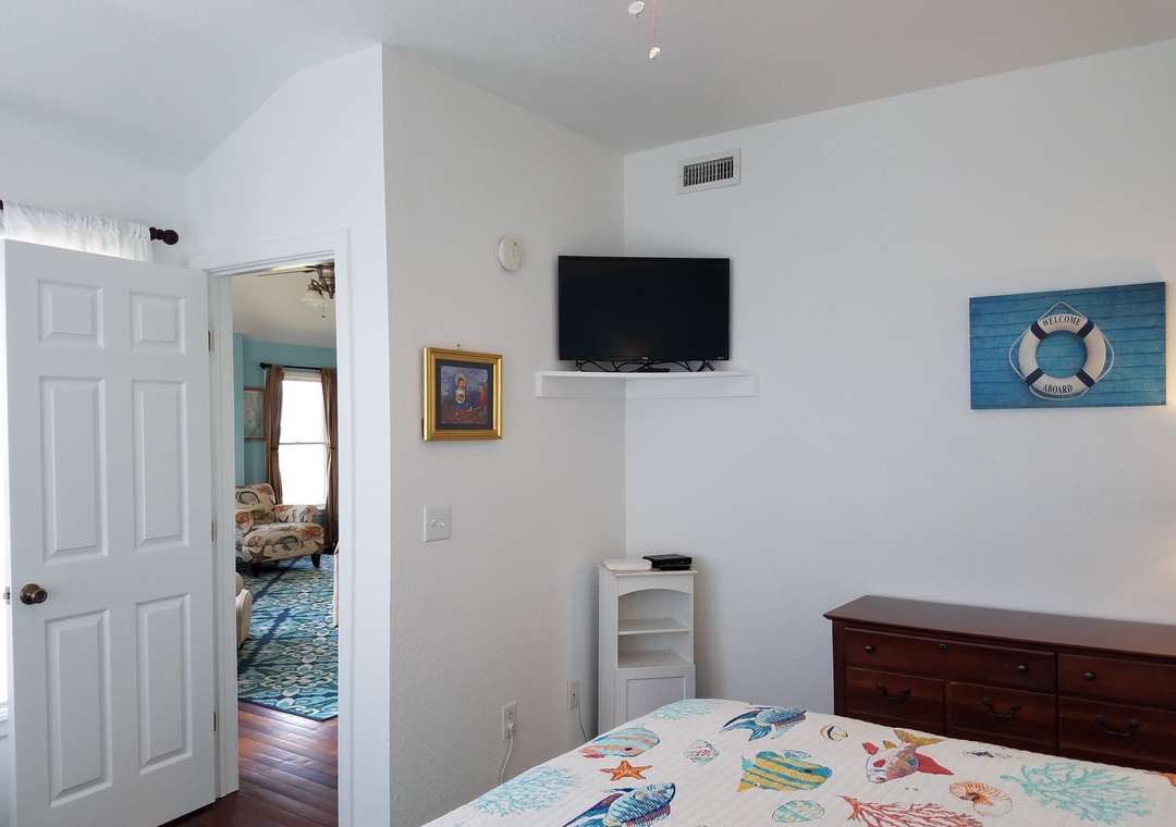 Second Floor: Open kitchen, dining and living area with TV. Queen Sleeper Sofa in living area. Primary Bedroom with King bed, TV, and Primary Bath with whirlpool tub and separate shower.