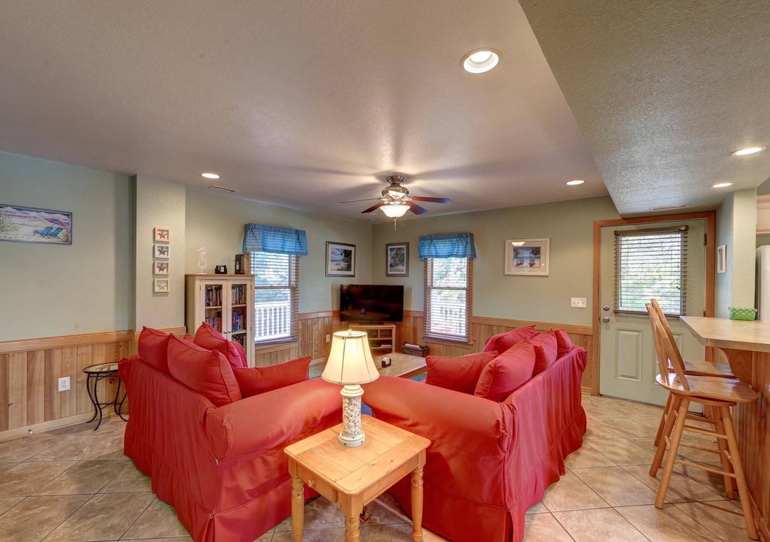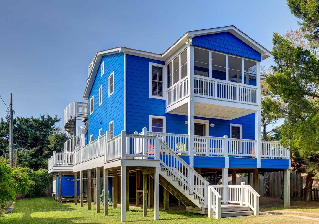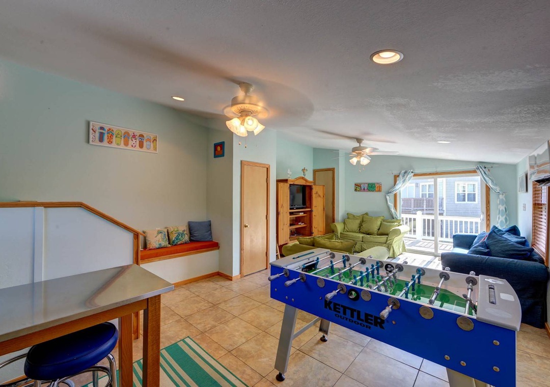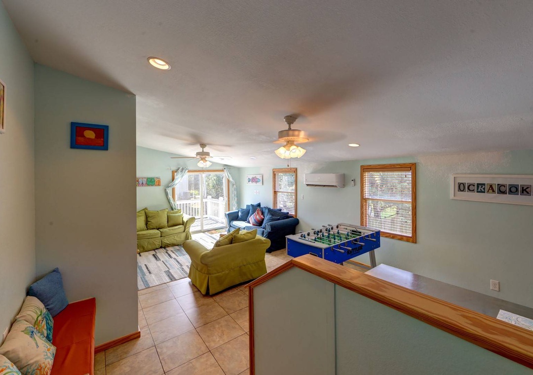 Welcome to Diamond In The Rough, a spacious five-bedroom home in the sought-after Up Trent neighborhood of Ocracoke. This hidden gem is located on a quiet street and surrounded by mature vegetation for privacy and seclusion. The canal access at the end of the road is ideal for launching kayaks or SUP's to explore the Pamlico Sound. The outdoor fun continues back at the house with a large yard, multiple decks and a screened porch. Make your way up the spiral staircase to the rooftop observation deck for a view of the sound. It's the perfect place to watch the sunset in the evenings with a refreshing beverage in hand. Inside, an open-concept great room offers plenty of space for spending time with family and friends. When you're not dining out at one of the nearby restaurants, prepare meals at home in the fully stocked kitchen. A large rec room on the main level can serve as a kid's hangout space or additional living area, complete with a foosball table for indoor entertainment.