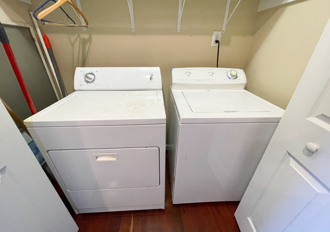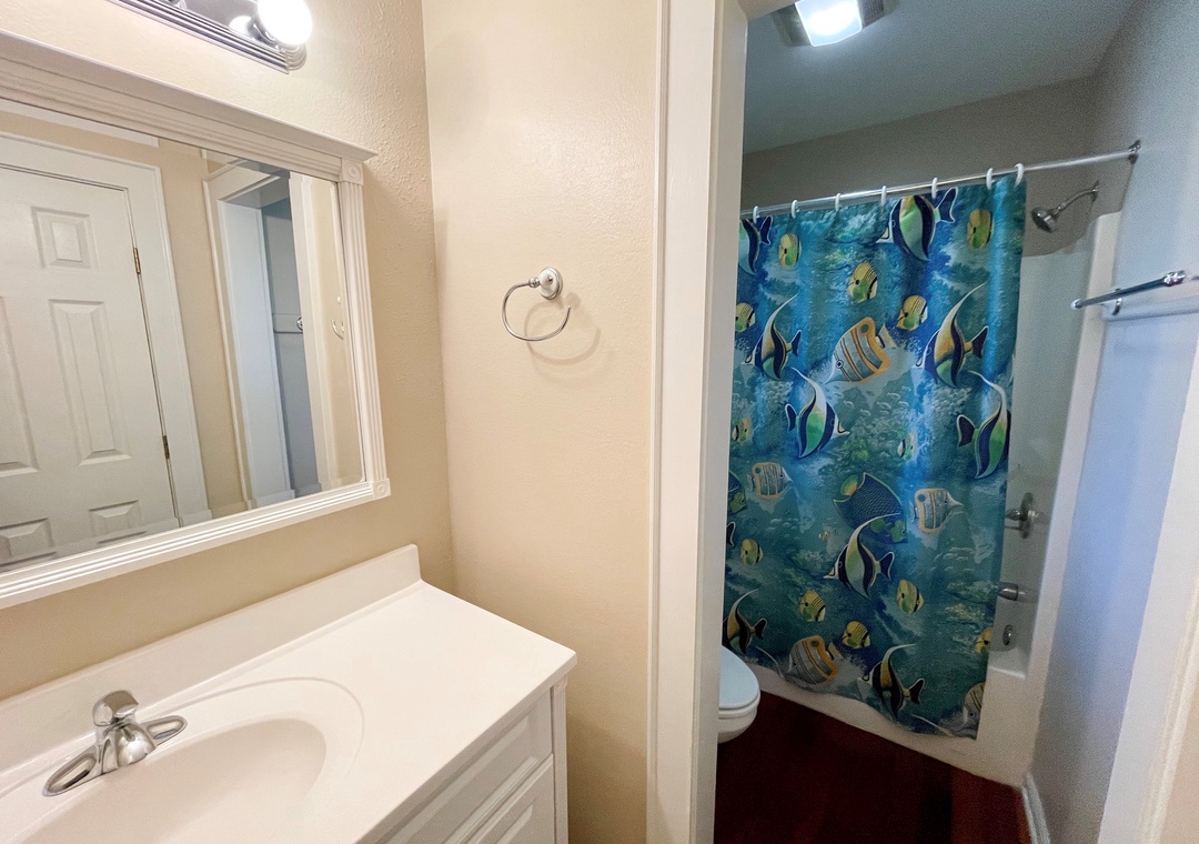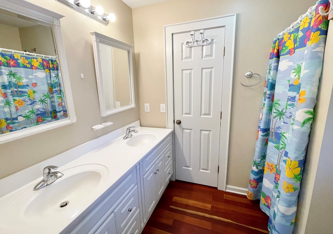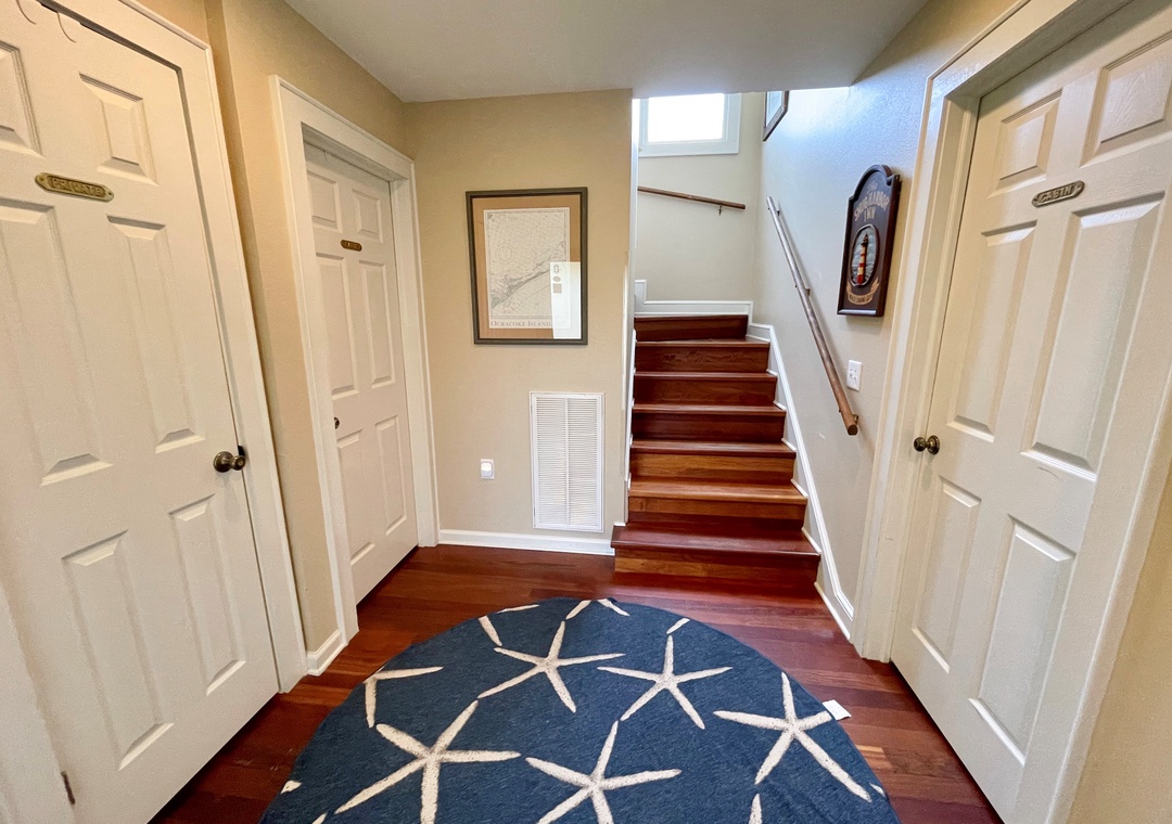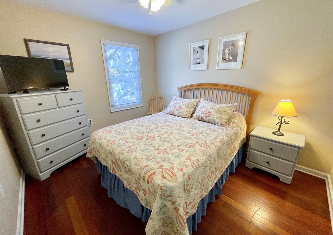First Floor: Bedroom with Queen bed, TV. Bedroom with two Twin beds. Shared Bath with shower. Primary Bedroom with Queen bed, TV, and Primary Bath with tub/shower. Laundry Closet.
