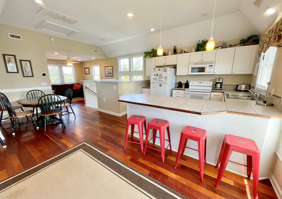 The second floor offers an open living room, dining room, kitchen and den area. A furnished sun deck expands your living area to the outdoors.