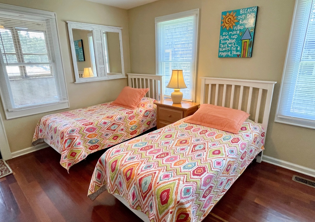 3 bedrooms, 3 Baths: Primary Bedroom with Queen and private bath. One bedroom with Queen and one bedroom with two Twins (which share a bathroom with shower only). Second floor full bath.
