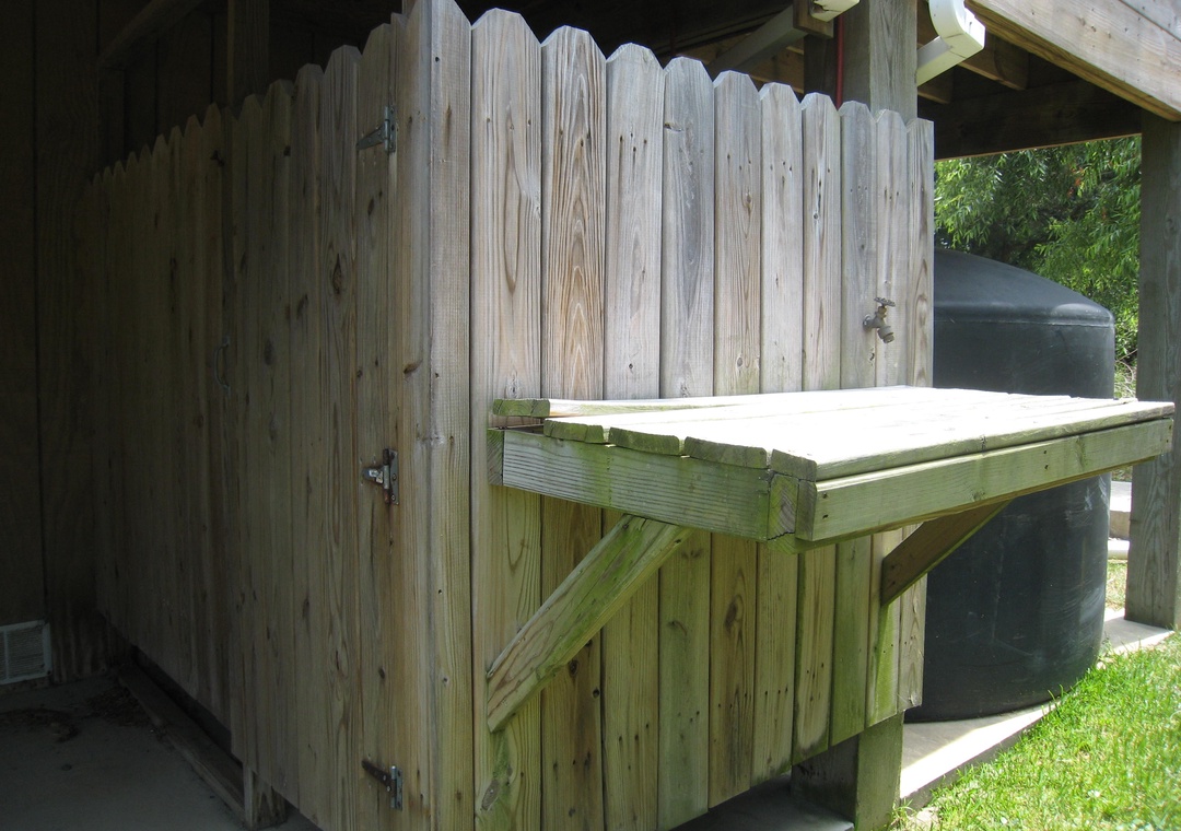 The exterior offers a screened porch with picnic table, open and covered deck, hot/cold outdoor shower, park style charcoal grill, fish cleaning bench, and an additional picnic table located under the house. Paved covered parking.