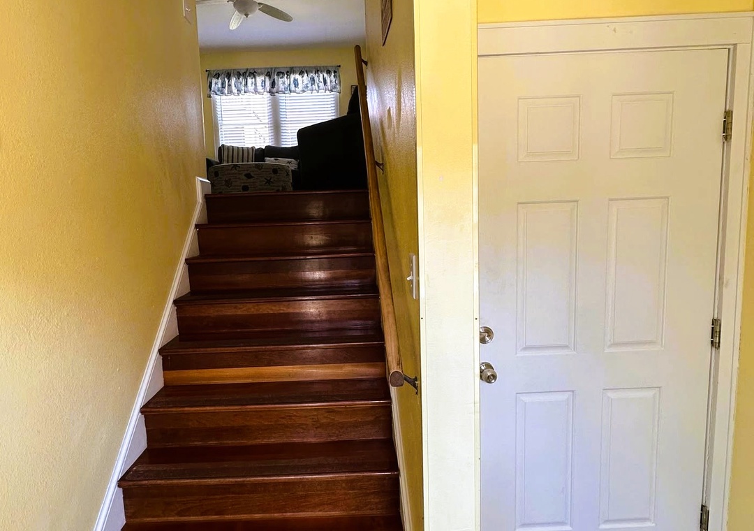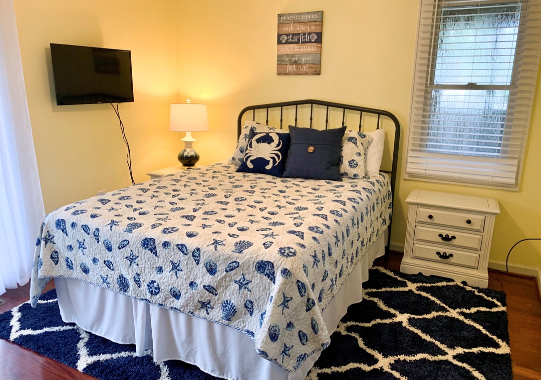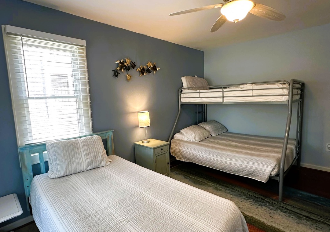 First Floor: Primary Bedroom with King bed, TV, Primary Bath with tub/shower and private screened porch. Bedroom with Queen, TV and screened porch access. Bedroom with Pyramid Bunk Bed (Double on bottom/Twin on top) and Twin bed, TV and screened porch access. Den with Queen Sleeper Sofa, TV. Laundry Closet. Hallway Bath with tub/shower. Stairway Half Bath.