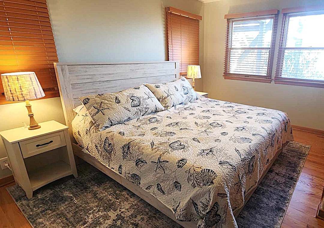 Second Floor: Open Living Room and Kitchen, Half Bath, Access to deck and a screened porch, Master Bedroom with King and Master Bath with tiled shower.