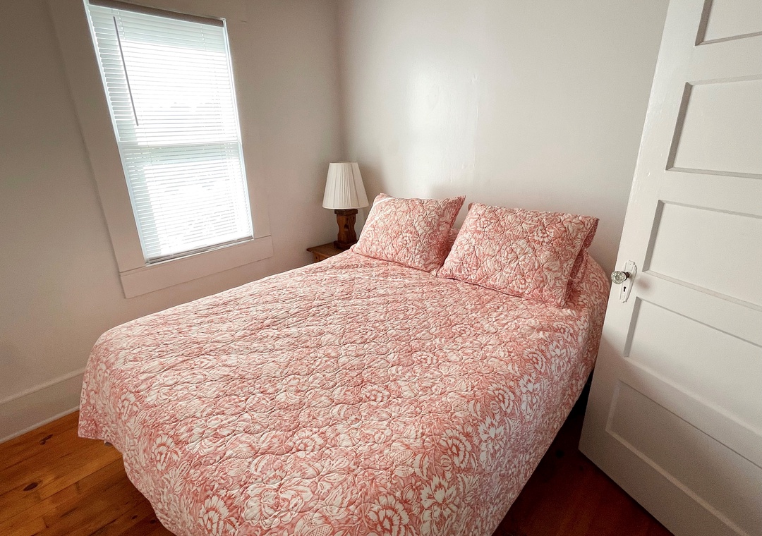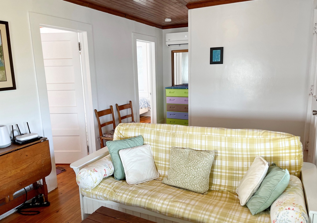 Single story home: Living Room with TV, adjoining Kitchen. Bedroom with Queen bed. Bedroom with two Twin beds. Bath with Claw Foot Tub/Shower.