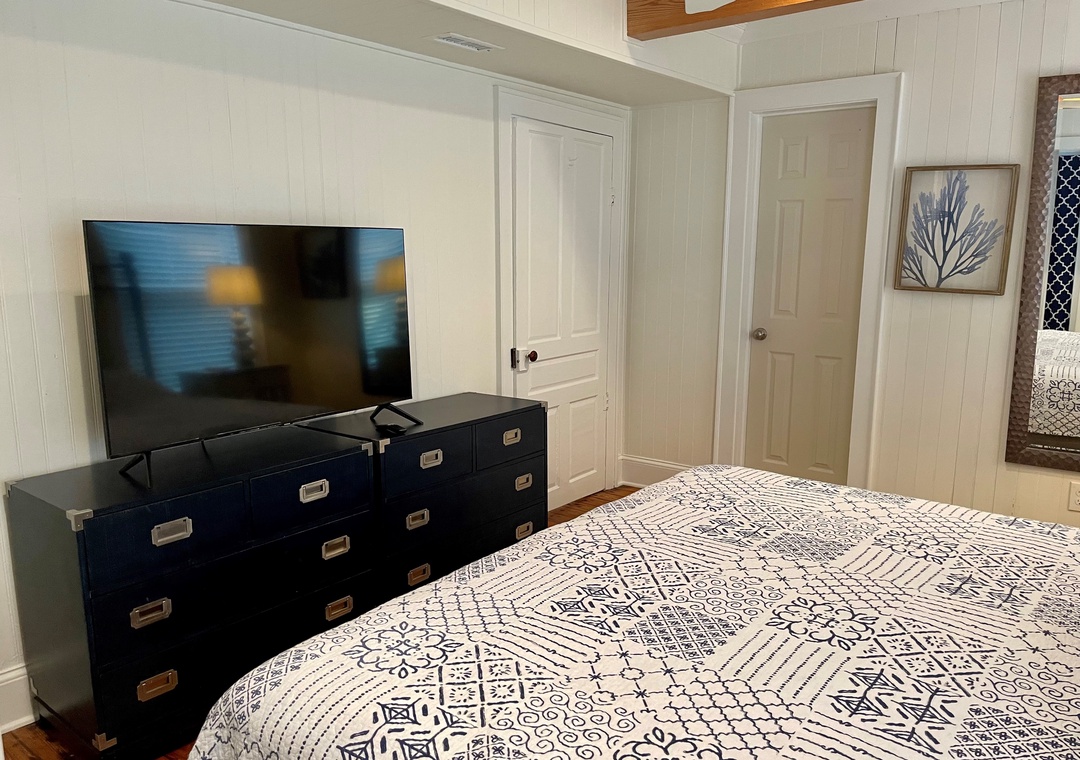 First Floor: Living Room with TV. Eat-in Kitchen and Dining Area. Primary Bedroom with King bed, TV and Primary Bath with shower. Second first floor Bath with shower. Stackable washer/dryer in kitchen.