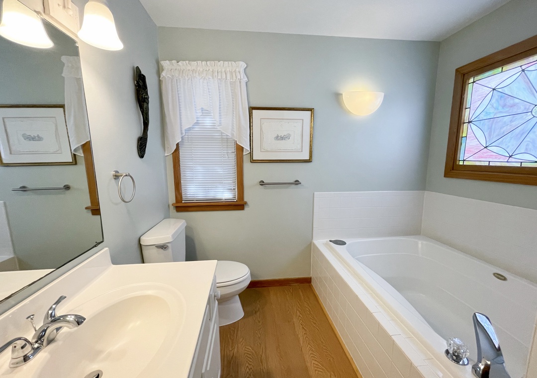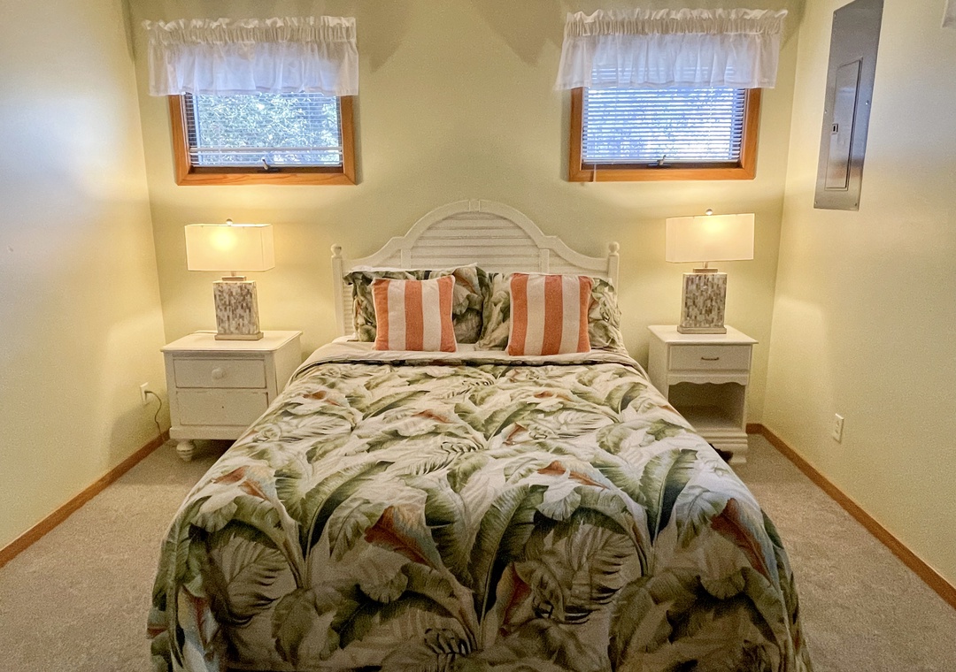 1 Bedroom, 1.5 Baths: First floor bedroom with Queen. Upstairs Sleeping Loft with King and adjoining half bath. The full bath offers a garden tub (4x6) and a shower stall.